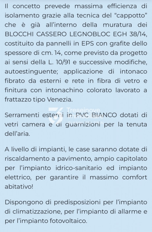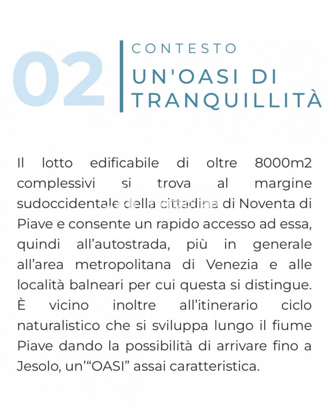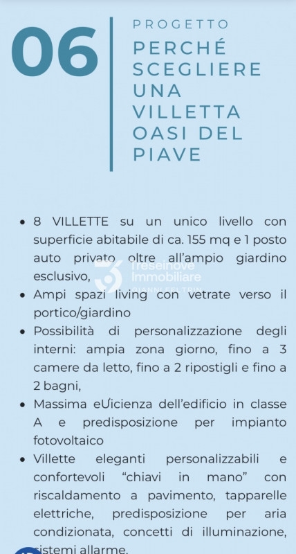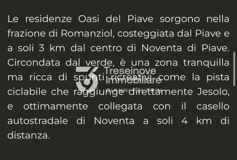 (per info simone g ) ultime porzioni disponibili !!! le residenze 'oasi del piave' sorgono nella frazione di romanziol, a soli 3 km dal centro di noventa di piave. Circondata dal verde, è una zona tranquilla ma ricca di spunti ricreativi come la pista ciclabile che raggiunge direttamente jesolo e ottimamente collegata con il casello autostradale di noventa. Scegliete tra le 8 villette in unico livello, con la possibilità di personalizzazione degli spazi interni in base alle vostre esigenze, si compongono di ampia zona giorno open space di 55mq. Con vista su portico di 20mq., disimpegno, camera padronale di oltre 18mq., 2 camere doppie, 2 bagni, ripostiglio, garage di 25mq., ampio giardino di proprietà. Le unità immobiliari saranno edificate con la massima efficienza sia per gli isolamenti termici ed acustici che per quelli impiantistici. Classe a4. Consegna fine 2025. Rif. B0018