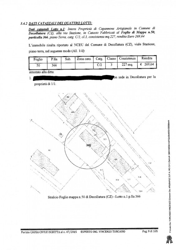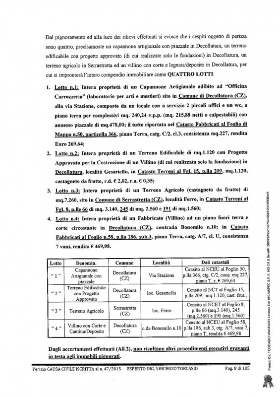 Villa all'asta a decollatura (cz)si propone la partecipazione all'asta di una splendida residenza situata in una tranquilla zona di decollatura, provincia di catanzaro. Questa affascinante proprietà sarà messa all'asta presso il tribunale di lamezia terme, offrendoti l'opportunità di fare un'offerta a partire da soli 21075 €. La residenza è un villino indipendente a un piano con una superficie totale di 129,15 metri quadrati. Dispone di una corte circostante di 646 metri quadrati e un piccolo fabbricato antistante utilizzato come cantina/deposito di 30,96 metri quadrati. All'interno, troverai un ampio soggiorno, una cucina pranzo con vista su un portico coperto, due camere da letto, un bagno e un ripostiglio. Attualmente occupata dal debitore e dalla sua famiglia. Per ulteriori dettagli, ti invitiamo a contattarci utilizzando i nostri recapiti.chi siamoimmobiliallasta.it aiuta le persone a comprare casa all'asta e migliorare la qualità della loro vita senza correre rischi, grazie ad una piattaforma specializzata in aste immobiliari sviluppata intorno alle vere esigenze di chi cerca casa all'asta e ad un team di 30 professionisti esperti dedicato, che ti guida passo passo in un acquisto sicuro e certificato da una tripla garanzia sull'immobile e sul servizio.a differenza delle agenzie troverai:+ varietà: gestiamo migliaia di immobili ogni mese+ tranquillità: tripla garanzia che ti tutela da ogni rischio sull'acquistoalcuni risultati oggettivi nell'ultimo anno e mezzo:- 8.600 immobili gestiti- +500 clienti portati all'asta- +200 case aggiudicate, per un valore totale di 15 milionicontattaci subito per parlare con uno dei nostri consulenti che ti aiuterà a trovare la tua casa all'asta senza correre rischi.
