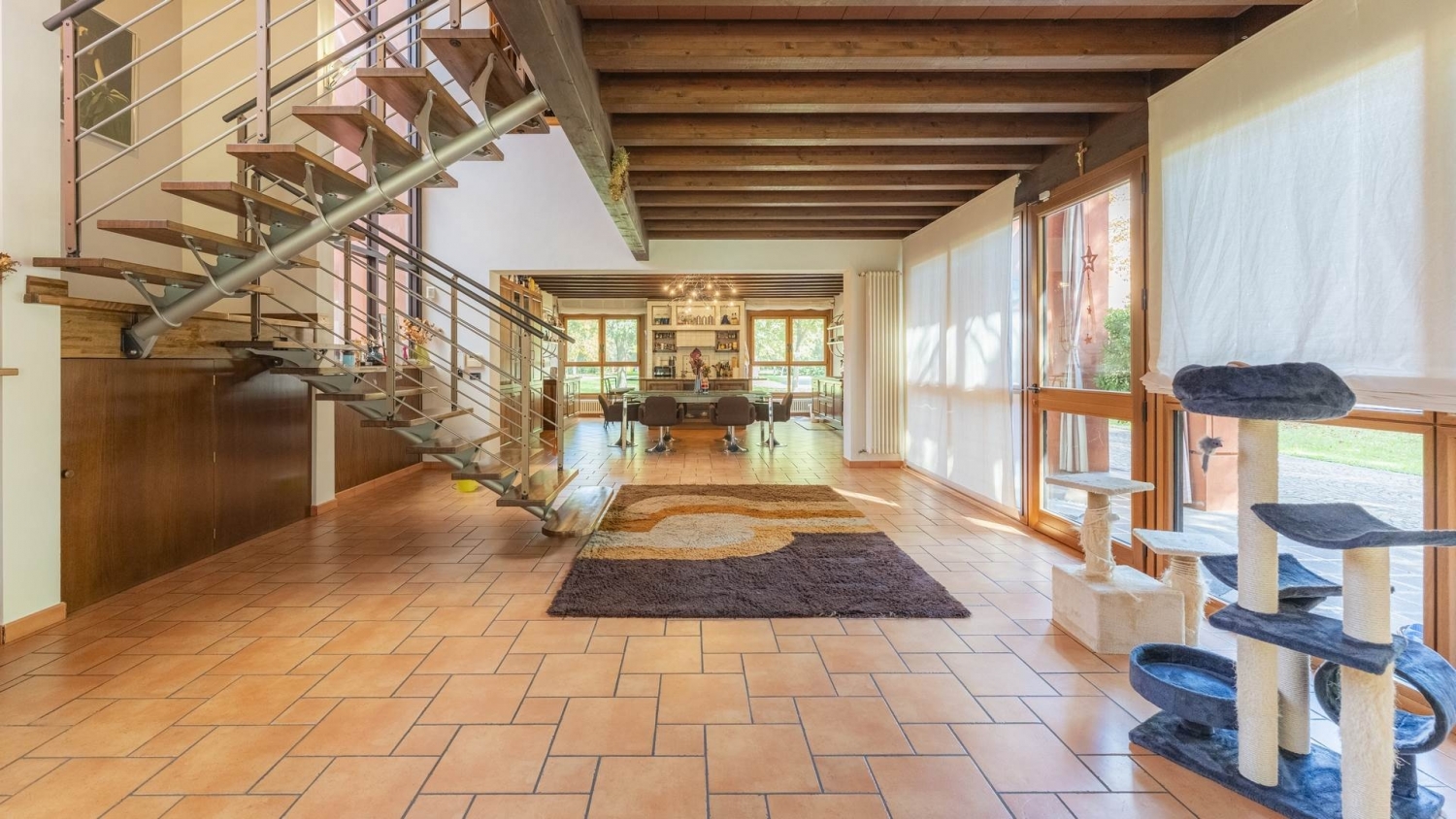 Cod 2843 villa bifamiliare signorile medollaintroduzionela remax unicorn vende a medolla una villa plurifamiliare dal design originale, la cui architettura d'autore dona spazi abitativi aperti, di ampia superficie e dalla luminosità speciale.la villa è collocata in una posizione appartata di medolla, nonostante l'accesso alla proprietà sia dalla strada provinciale, la quale collega velocemente medolla a san felice sul panaro e viceversa.la villa è stata disegnata con geometrie regolari tipiche dell'architettura moderna e funzionalista e tutti gli spazi richiamano lo stile industriale o 'loft'.le ampie vetrate donano senso di continuità con il verde circostante, i materiali semplici ed espressivi quali metallo, vetro e legno donano continuità e pulizia visiva. esterni si accede alla proprietà da una larga cancellata, tramite il vialetto in porfido che prosegue attorno alla villa fino agli accessi dei garage.i garage sono in totale 2 con due posti macchina ciascuno, oltre ad un terzo spazio coperto, per un totale di 6 posti auto al chiuso.gli spazi di transizione tra le abitazione e l'esterno sono coperti da portici e dalle larghe falde del tetto. fa eccezione il cortile interno, volutamente scoperto a pozzo di luce e circondato dalle mura delle abitazioni, creato apposta per momenti di relax e convivialità.il giardino perimetrale è in continuità con il verde privato della villa storica padronale, la quale è collocata a circa 100 metri di distanza dalla villa in vendita.internila villa bifamiliare è disposta su piano terra e primo, con tre scale interne.la prima abitazione è costituita da un grande soggiorno con il camino a legna, il disimpegno e le scale a giorno, a seguire la cucina aperta, volutamente allineata in prospettiva con il camino.le travi e le vetrate scandiscono visivamente gli ambienti e questo ritmo strutturale si ripete in tutta la casa.seguono, a piano terra, gli ambienti accessori quali un ampio sgombero, il locale caldaia, il bagno e la cantina.tramite le funzionali scale a giorno di legno e acciaio, si arriva al piano superiore su un grande ballatoio, cha fa da disimpegno alle due camere da letto matrimoniali: ciascuna camera è dotata di bagno privato e armadiature.questa abitazione è caratterizzata da arredi fissi integrati, tra cui la cucina, l 'arredo bagno ed i box doccia: grazie a questo accorgimento, lo stato di conservazione è eccellente.comunicanti con questa abitazione, sono il cortile interno, il garage e un locale open space, disposto sul piano primo e collegato con la scala a chiocciola, nella sua qualità di soffitta valorizzata e autonoma: una deliziosa parte della casa ideale per familiari che vogliono una certa indipendenza.la seconda abitazione ha una distribuzione più compatta, costituita al piano terra da un bell'ingresso, la cucina ed il soggiorno, con un bagno di servizio.al piano superiore 2 camere da letto molto grandi, ancora un ballatoio ampio quanto un salotto ed il bagno.le travi a vista nella parte superiore, visibili anche dai lati, sporgenti e molto coprenti verso l'esterno, comunicano solidità agli ambienti e un tocco architettonico tecnico ed elegante.nel complesso lo studio pragmatico di questa villa, con richiami rustico-industriali ha garantito nel tempo una convivenza armoniosa tra i due nuclei familiari con una gestione non dispersiva e nemmeno dispendiosa degli spazi comuni, favorendo l'ottimo stato conservativo attuale dello stabile. Classe energetica: non indicata