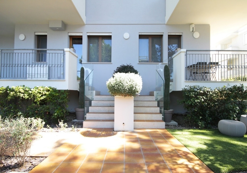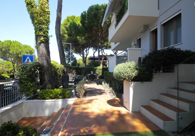 Riccione paese 700 metri dal mare in zona molto comoda e servita.splendido appartamento di recente e totale ristrutturazione dove un'attenta riorganizzazione degli spazi ha permesso di massimizzare la funzionalità degli ambienti e la combinazione di illuminazione naturale e artificiale crea un'atmosfera luminosa e accogliente.sito al piano rialzato di palazzina da 8 unità immobiliari mantiene una sua indipendenza trovandosi libero su 3 lati.ingresso privato dal giardino esclusivo piantumato e in parte pavimentato.luminosa e spaziosa zona soggiorno con cucina di pregio abitabile, separata da porta a vetro scorrevole con piano induzione, 5 fornelli a gas, griglia a piano.la zona notte si compone di camera padronale con bagno in camera con doccia 'walk in', camera doppia e cameretta. secondo bagno con vasca da bagno con illuminazione led e cascata. Ripostiglio e lavanderia che collegano l'appartamento al garage doppio con 2 basculanti elettriche e alla cantina. I balconi che corrono sui 3 lati sono comodi e abitabili.gli arredi su misura sono inclusi nel prezzo cosù come riscaldamento a pavimento, pannelli solari per acqua calda, infissi in legno e pvc con doppio vetro e pavimenti in legno, porta blindata, impianto di aspirazione a muro, aria condizionata canalizzata, allarme, termo camino a legna, vcm nella camera padronale, zanzariere, tapparelle elettriche, impianto d'allarme e domotica.