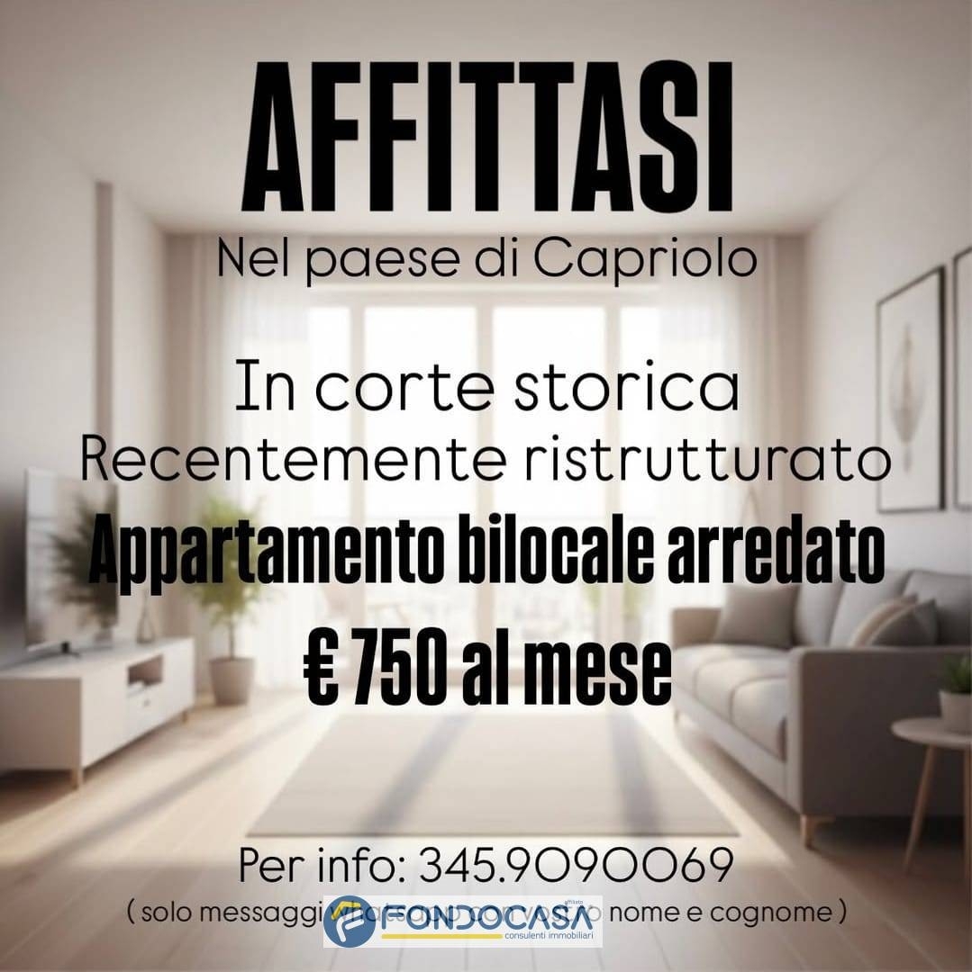 A solo persone referenziate, affittasi in centro paese di capriolo, in casa a corte, signorile, interni da rivista, spazioso e luminoso appartamento bilocale posto al piano 1°, completamente arredato con gusto e composto da: ingresso, ampio soggiorno con cucina abitabile open-space, corridoio notte, camera matrimoniale con cabina armadio, bagno con doccia 'walk in'.appartamento libero da febbraio 2026, minime spese condominiali.-nota: alcuni dati descrittivi potrebbero essere solo approssimativi, esempio; spese di riscaldamento, spese condominiali, indirizzo, metrature, pertanto verranno comunicate in modo completo telefonicamente o in fase appuntamento, non costituendo elemento contrattuale.-stai cercando la nuova casa o hai trovato la tua casa ideale ma devi vendere casa tua per comprare?servizio 'acquisto / permute fondocasa', chiedi informazioni sul servizio 'acquisto / permuta' alle agenzie immobiliari fondocasa di palazzolo, rovato e cazzago san martino, tramutiamo la tua casa da vendere in liquidita' corrente.-visite e info agenzia immobiliare fondocasa rovato ° anniversary l'agenzia immobiliare piu' storica di rovato in via corso bonomelli 66/68 tel cell siamo presenti anche nell'ufficio commerciale di cazzago san martino via 4 novembre tel