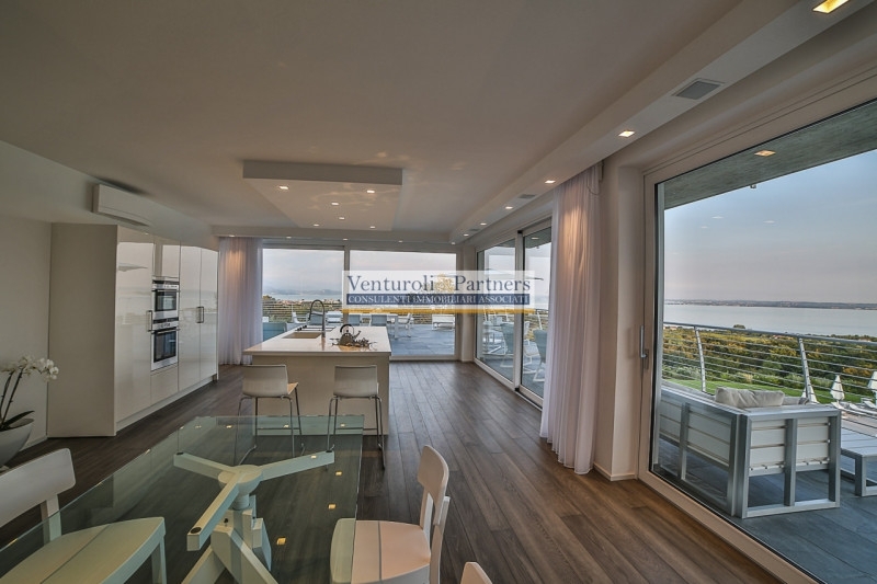 Padenghe sul garda, in contesto prestigioso e riservato, attico dotato di domotica e finiture lussuose, in posizione dominante il lago. Secondo e ultimo piano serviti da acensore, accesso su ampia e luminosa zona giorno totalmente con vetrata vista lago, accesso a spaziosa terrazza panoramica anch'essa vista lago, prima zona notte composta da camera matrimoniale, cameretta e bagno, seconda zona notte con camera matrimoniale e bagno padronale, a completare l'attico con accesso da scala interna ampio solarium con sauna e vasca idromassaggio, totale vista lago.nell'interrato è stato creata una zona per ospiti o zona relax, con angolo cucina/soggiorno, camera matrimoniale, bagno ed area lavanderia, adiacente a questa zona comodo box doppio.