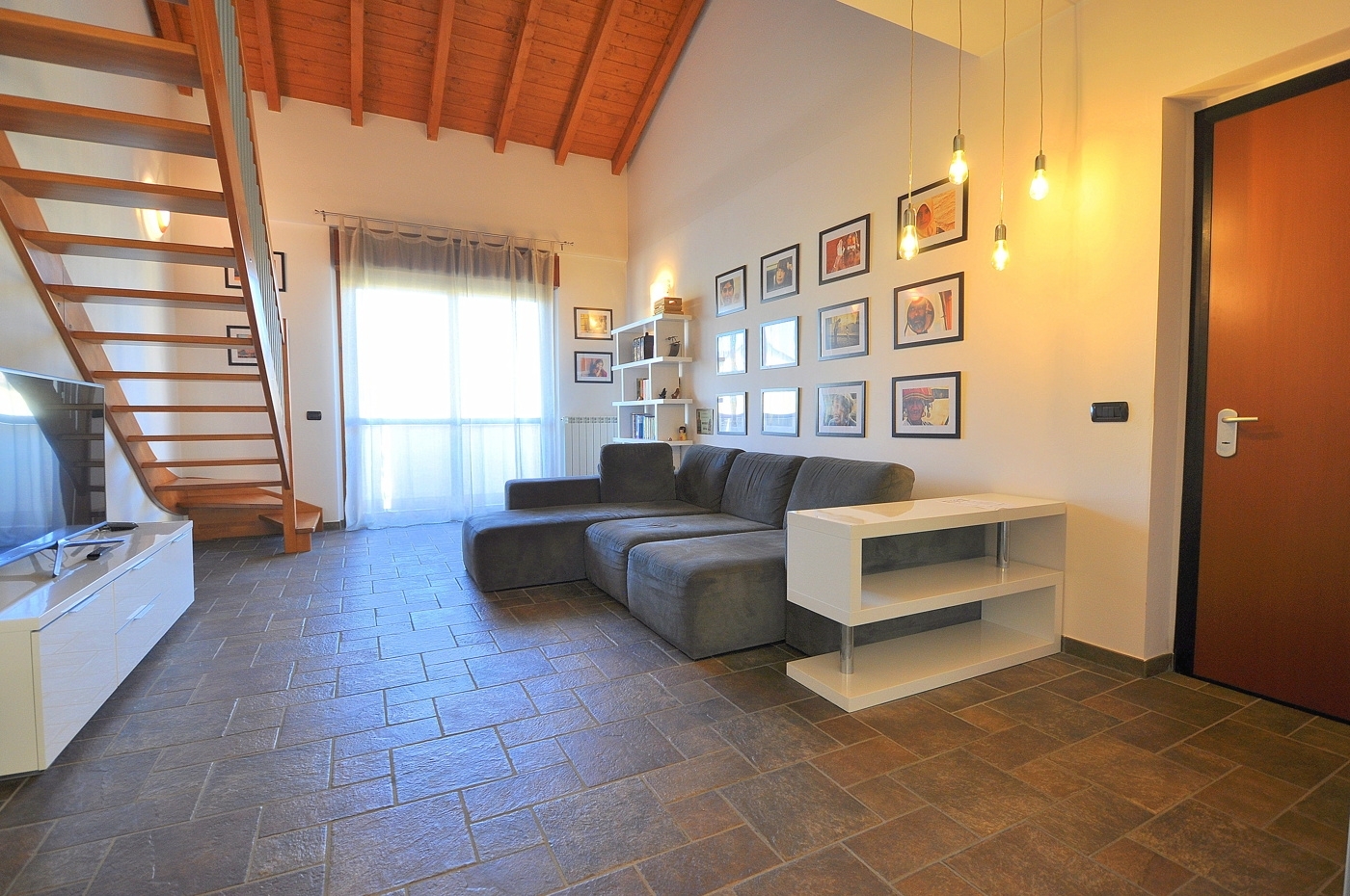 Caratteristica ed eslusiva abitazione di quattro locali con soppalco a vista posta in un piccolo contesto di sole quattro famiglie con minime spese comuni.l'appartamento e' sito al piano primo senza nessun lato abitativo in confine con altri e' composto da sala, cucina separata, due camere e bagno.dalla sala una comoda scala ci conduce all'ampio locale soppalcato a vista sulla zona giorno, dove e' possibile ricavare il quarto locale ed un altro servizio.completa la proprieta' la cantina.data la recente costruzione la casa si presenta in ottime condizioni sia strutturali che a livello di finiture.ideale per famiglie numerose oppure semplicemente per chi cerca una casa unica nel suo genere; ideale anche come forma d'investimento dato che e' affittata regolarmente con affitti brevi ed ottimi guadagni (8 % annuo)ampio box doppio proposto ad euro 20.000