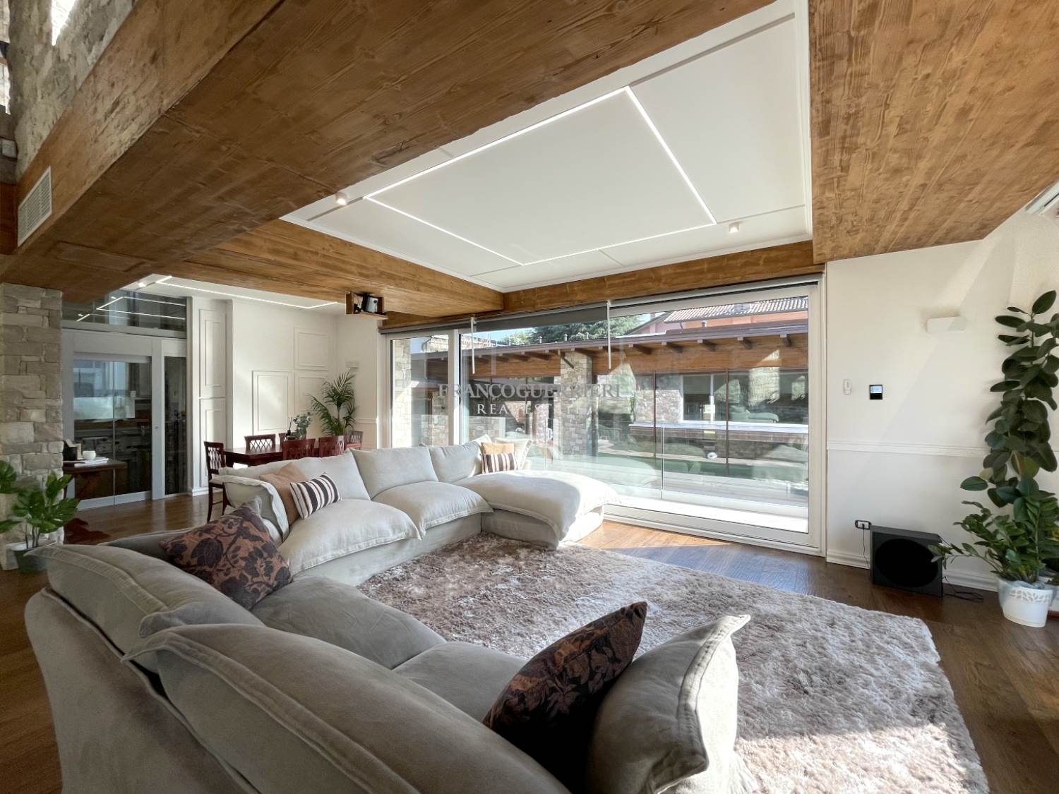 In una tranquilla zona residenziale, proponiamo una villa di recente costruzione dal design spettacolare e unico, che vanta una superficie utile complessiva di 577 mq ca.questa residenza progettata con attenzione ai dettagli e ai più alti standard di comfort, offre ambienti ergonomici e luminosi grazie a soluzioni architettoniche all'avanguardia.l'esterno è rivestito in pietra naturale, un elemento che si estende all'interno della casa, creando un armonioso legame con i dettagli in legno e le ampie superfici vetrate.l'ingresso principale si apre su un ampio salone a doppia altezza, impreziosito da un elegante lampadario che cattura lo sguardo e illumina l'ambiente. La disposizione su falsi piani conferisce movimento alla struttura, differenziando gli spazi con stile e funzionalità.procedendo verso la zona notte, troviamo due camere da letto e due bagni rifiniti in pregiato marmo. Salendo ancora, si accede a una splendida terrazza, perfettamente arredata per accogliere ospiti e ideale per godere di momenti di relax. Un ulteriore piano ospita la cucina e la sala da pranzo, con un design sofisticato e distintivo, pensato per esaltare la convivialità. Tutti i livelli sono comodamente collegati da una scala di design e da un ascensore in cristallo.dal salone principale, scendendo alcuni gradini, si raggiunge un'ampia sala attualmente adibita a area giochi per bambini, perfetta anche come terza camera da letto. Scendendo ancora, un grande spazio versatile può facilmente ospitare una camera supplementare con bagno. Il piano seminterrato include locali di sgombero, una lavanderia e stireria.la villa è circondata da un incantevole giardino, con un camminamento in pietra che conduce alla raffinata dependance, pensata come oasi benessere. Questa area spa comprende una piscina coperta riscaldata, bagno turco, sauna, bagno e un portico con jacuzzi, oltre a uno spazio perfetto per una palestra privata.l'immobile è dotato di riscaldamento a pavimento, aria condizionata canalizzata e un sistema domotico per la gestione intelligente dei servizi. I pannelli solari con batterie di accumulo e colonnine per la ricarica di veicoli elettrici completano questa residenza moderna, rendendola un autentico gioiello di stile e tecnologia.canone di locazione euro 120.000,00/anno.la proprietà viene proposta anche in vendita ad euro 2.600.000,00, con possibilità di acquistare ulteriore area di 300 mq, ideali per edificare un'ampia autorimessa con tre posti auto coperti e cinque posti auto scoperti, ad euro 200.000,00.indice di prestazione energetica in attesa di certificazione.note: le metrature sono del tutto indicative non potranno essere utilizzate come parte integrante in un eventuale contratto di vendita o locazione della proprietà. Classe energetica: non indicata