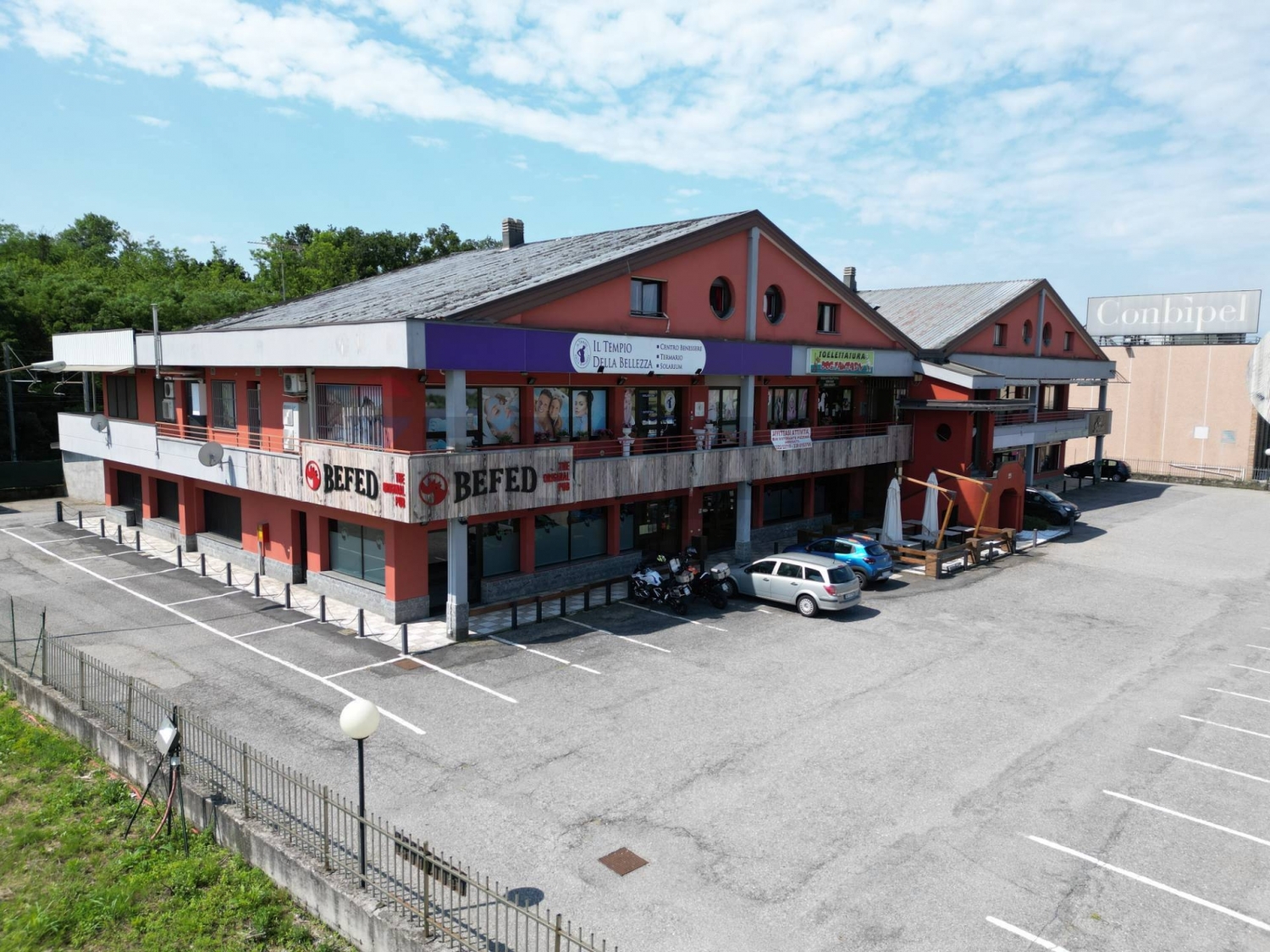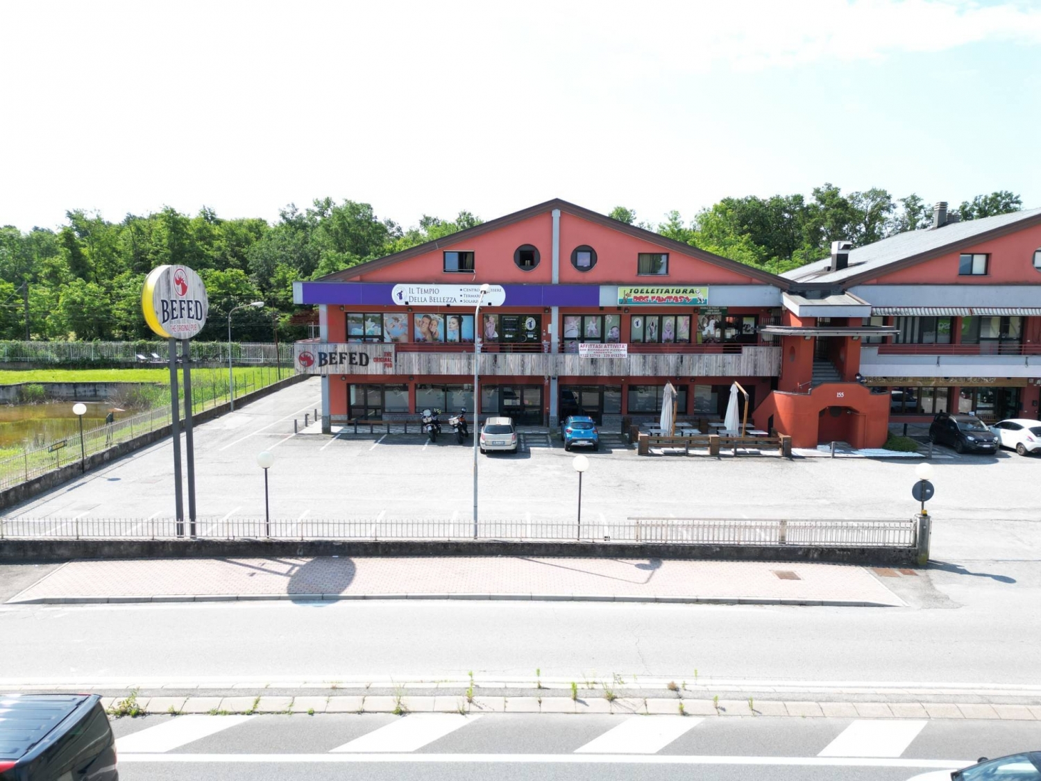 Complesso immobiliare su strada del sempionela proprietà, situata su una delle vie di maggior percorrenza del collegamento tra arona e castelletto sopra ticino, si compone di un fabbricato oltre che il piazzale di pertinenza e due box auto doppi. l'edificio, sviluppato su tre livelli, è cosù articolato:al piano terra troviamo un locale attualmente attrezzato per la ristorazione con un grande ambiente unico privo di partizioni interne fisse e corredato da una cucina a vista, due blocchi di servizi uno per il pubblico e uno per il personale. Nel primo blocco destinato agli avventori sono presenti due bagni per le donne due bagni per gli uomini e un bagno per disabili. il secondo blocco invece ospita gli spogliatoi e i bagni per gli addetti ai lavori. Al piano è presente inoltre un'ampia cucina a vista sulla sala principale e altri locali accessori funzionali l'attività di ristorazione. Un accesso dal retro consente di rendere agevoli le operazioni di scarico delle materie prime.il piano terra usufruisce di un déhor privato e pavimentato in graniglia sul piazzale principale. al primo piano sono presenti due unità che attualmente ospitano un centro estetico e una tolettatura. Gli ambienti all'interno delle unità sono divisi da pareti mobili opportunamente disposte. l'ultimo piano accoglie due appartamenti di circa 100 mq, composti da soggiorno, cucina, due camere e bagno. l'accesso al piano primo e secondo avviene dai ballatoi che corrono lungo le tre facciate libere ed è garantito dal corpo scale esterno in comune con il complesso adiacente. gli impianti sono stati oggetto di recenti rinnovi e manutenzione e le attività sono corredate di tutte le necessarie predisposizioni previste dalla normativa in materia di sicurezza antincendio.l'ampio piazzale favorisce il parcheggio delle auto degli avventori alle attività oltre ad offrire il transito verso i box posti sul retro.