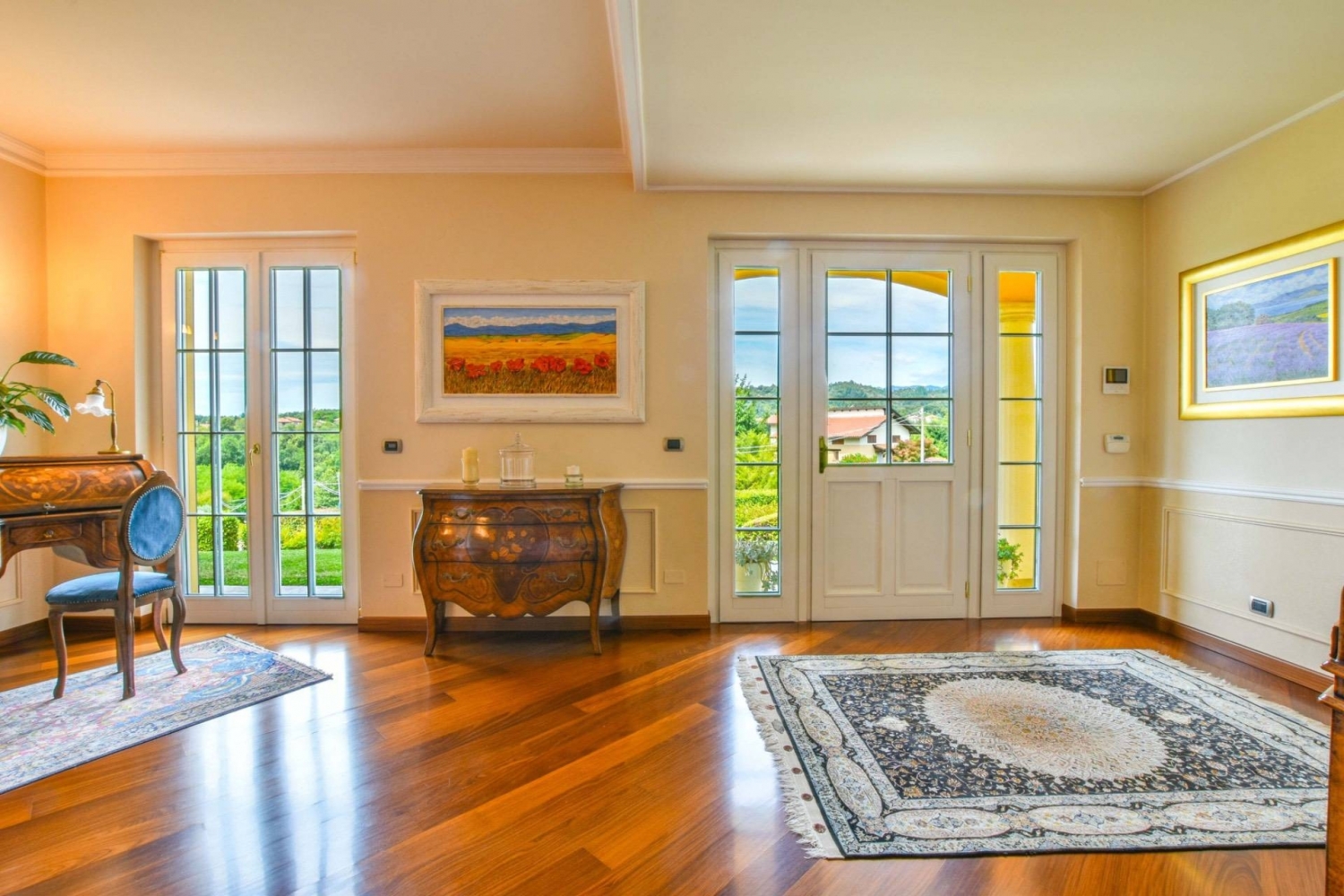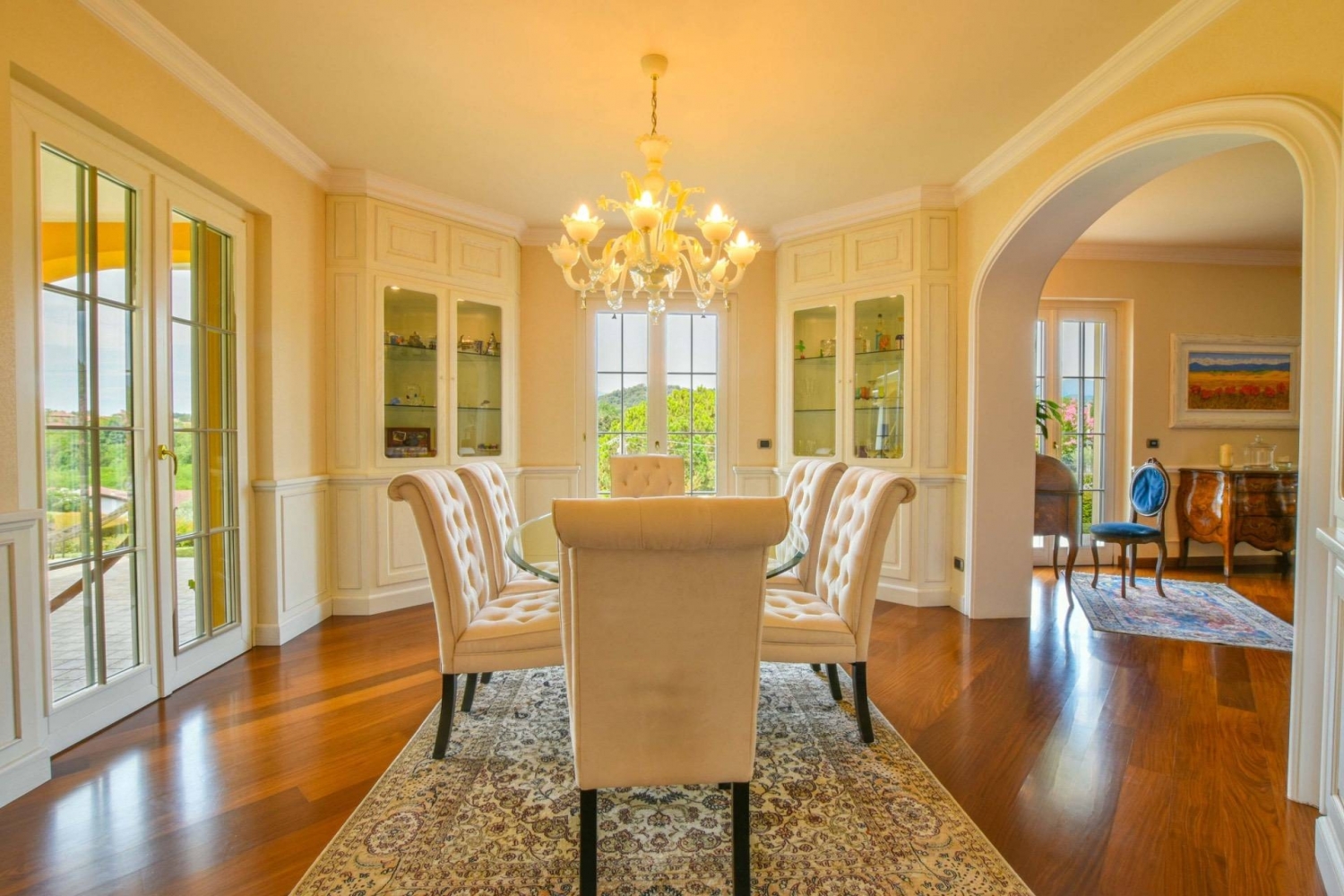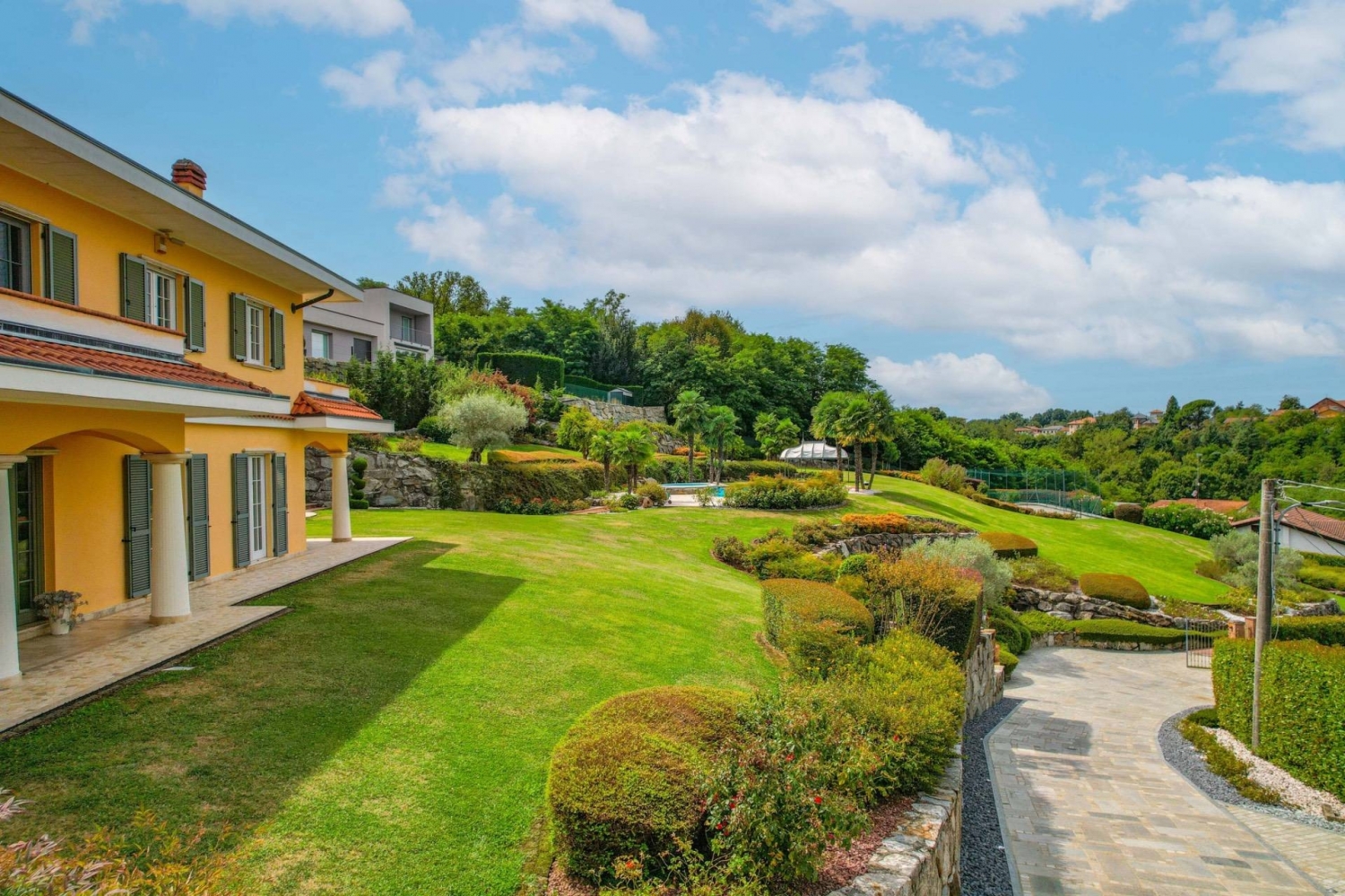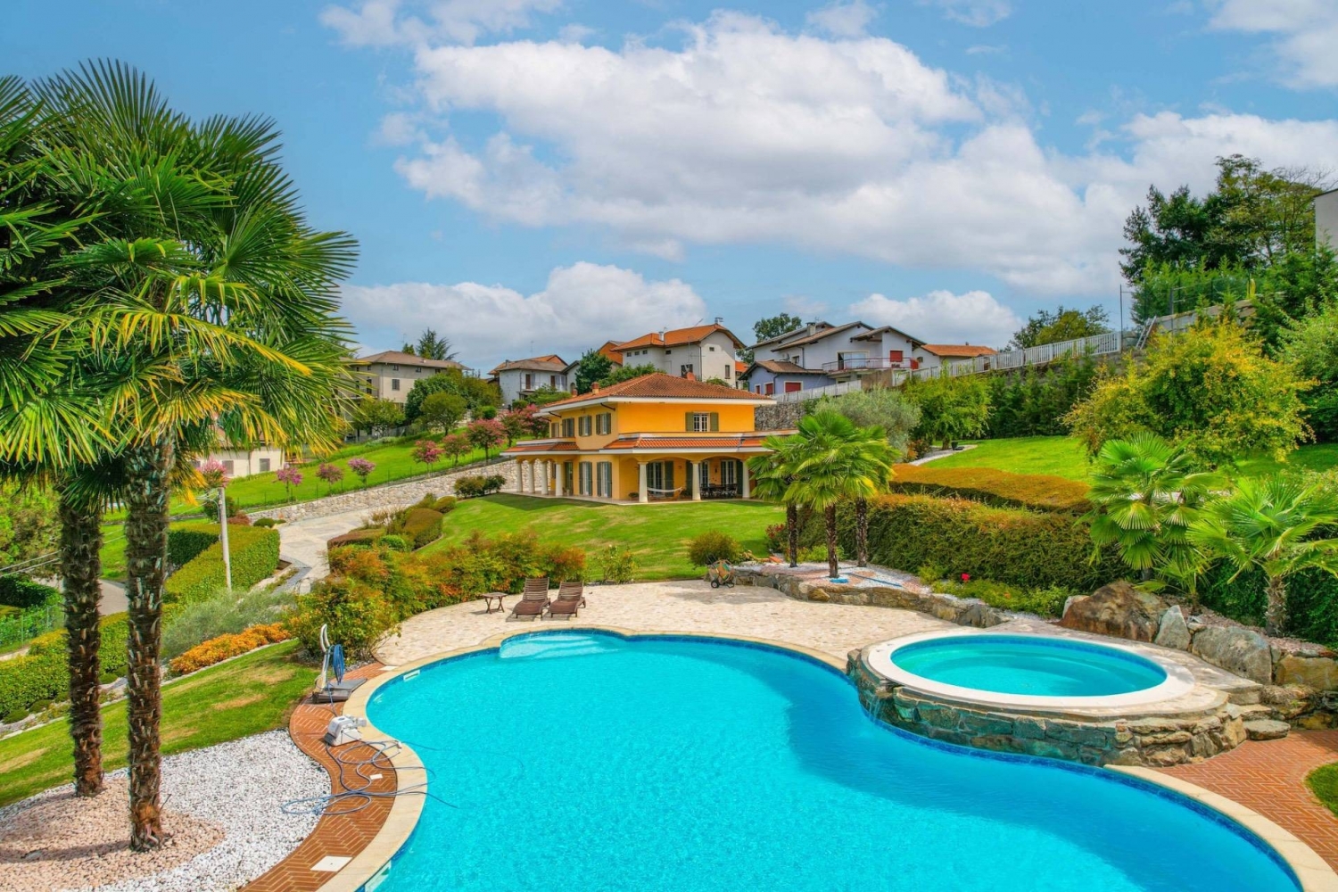 Immersa nel verde delle colline piemontesi, questa prestigiosa villa situata a roasio rappresenta una residenza di grande fascino, ideale per chi desidera vivere in un contesto riservato e panoramico senza rinunciare al comfort di una proprietà di alto livello.la villa è circondata da un ampio giardino privato, perfettamente curato e dotato di impianto di irrigazione automatizzato. Al centro del parco si trova una scenografica piscina riscaldata di 19 x 10 metri, alimentata da un moderno impianto solare, affiancata da una vasca idromassaggio che garantisce momenti di assoluto relax e privacy. La proprietà dispone inoltre di un campo da beach volley, elemento raro che arricchisce ulteriormente l'esperienza di vita all'aperto, trasformando il giardino in un autentico spazio dedicato al benessere e allo svago.gli interni della villa sono caratterizzati da ambienti ampi e luminosi, impreziositi da materiali di pregio e dettagli architettonici eleganti. L'ingresso conduce a un raffinato soggiorno con pavimenti in legno, che conferiscono calore e continuità agli spazi. La cucina, ampia e luminosa, è affiancata da una sala da pranzo formale, ideale per momenti conviviali e per ricevere ospiti.sul medesimo livello trovano spazio una palestra privata, una lavanderia, una cantina dedicata alla conservazione dei vini e un bagno di servizio. Il sistema di riscaldamento a pavimento garantisce un elevato comfort abitativo in ogni stagione.il piano superiore ospita la suite padronale, dotata di bagno privato con vasca di design, cabina armadio e balcone panoramico con vista sulle colline circostanti. Completano il livello tre ulteriori camere da letto, tutte luminose e di generose dimensioni, affacciate su un ampio terrazzo con vista sul giardino e servite da due bagni finemente rifiniti.i soffitti decorati con stucchi aggiungono eleganza agli ambienti, mentre un moderno sistema di allarme assicura la massima sicurezza per l'intera proprietà.questa residenza rappresenta una soluzione abitativa esclusiva, capace di coniugare privacy, comfort e qualità architettonica in uno scenario naturale di grande suggestione.