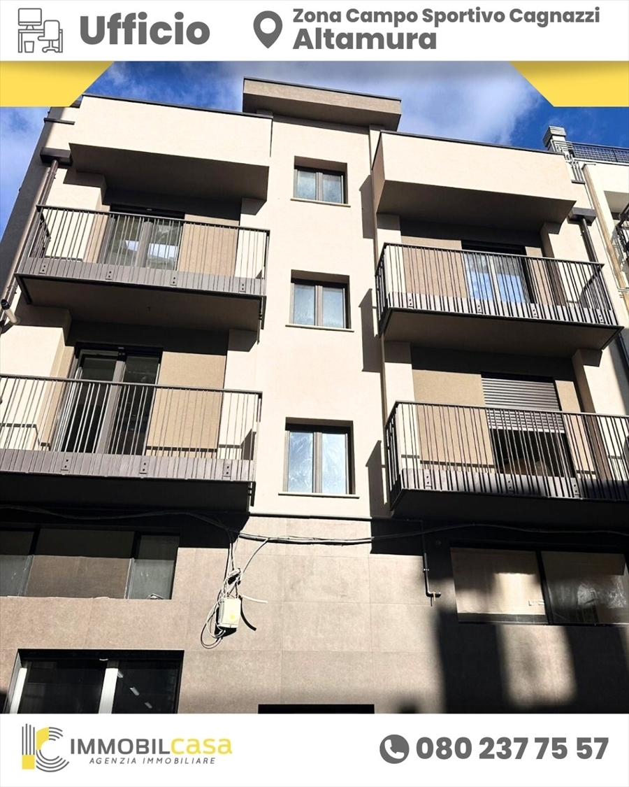 Rif. 9 ad altamura, nella centrale e ben servita zona del campo sportivo cagnazzi, proponiamo la vendita di un ufficio posto al piano rialzato di un palazzo recentemente ristrutturato esternamente. all'interno è composto da ingresso e 2 uffici serviti da un bagno per un totale di circa 60mq.l'immobile è in buono stato ed è libero
