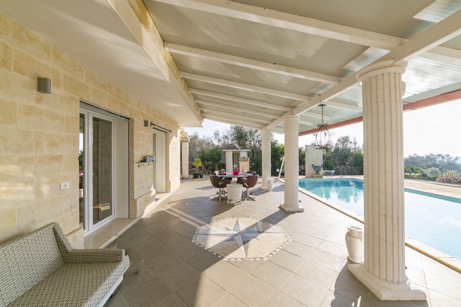 Nella cornice esclusiva e riservata di contrada demani, l'agenzia immobiliari riunite di nanna propone in vendita una villa unifamiliare di recente realizzazione, immersa nella natura e caratterizzata da una splendida vista mare, piscina privata e ampio terreno.la proprietà si estende su un terreno di circa 10.161 mq, con ulivi e macchia mediterranea, ed è completata da terrazzo con vano tecnico.accessi e spazi esternil'accesso avviene tramite cancello carrabile automatico, che conduce a un'ampia area parcheggio con più posti auto, di cui uno coperto da freschiera.all'esterno, la proprietà offre:- piscina interrata 10 x 5, inserita in un contesto di totale privacy- ampio porticato affacciato sulla piscina- veranda con travi in legno- due docce esterne- zona lavanderia esterna - terreno curato con vegetazione tipica mediterraneadistribuzione internadal portico si accede alla zona giorno composta da salone con cucina a vista, impreziosito da ampie vetrate panoramiche con affaccio sulla piscina e sul mare. Sono presenti quattro vani e due bagni.gli ambienti interni sono valorizzati da rivestimenti effetto tufo nel soggiorno e nella camera da letto; ogni stanza è dotata di impianto tv. l'immobile è dotato di videocitofono e wi-fi. caratteristiche costruttive e impiantistichela villa si distingue per l'elevata qualità costruttiva e le prestazioni energetiche di alto livello (classe a2).
