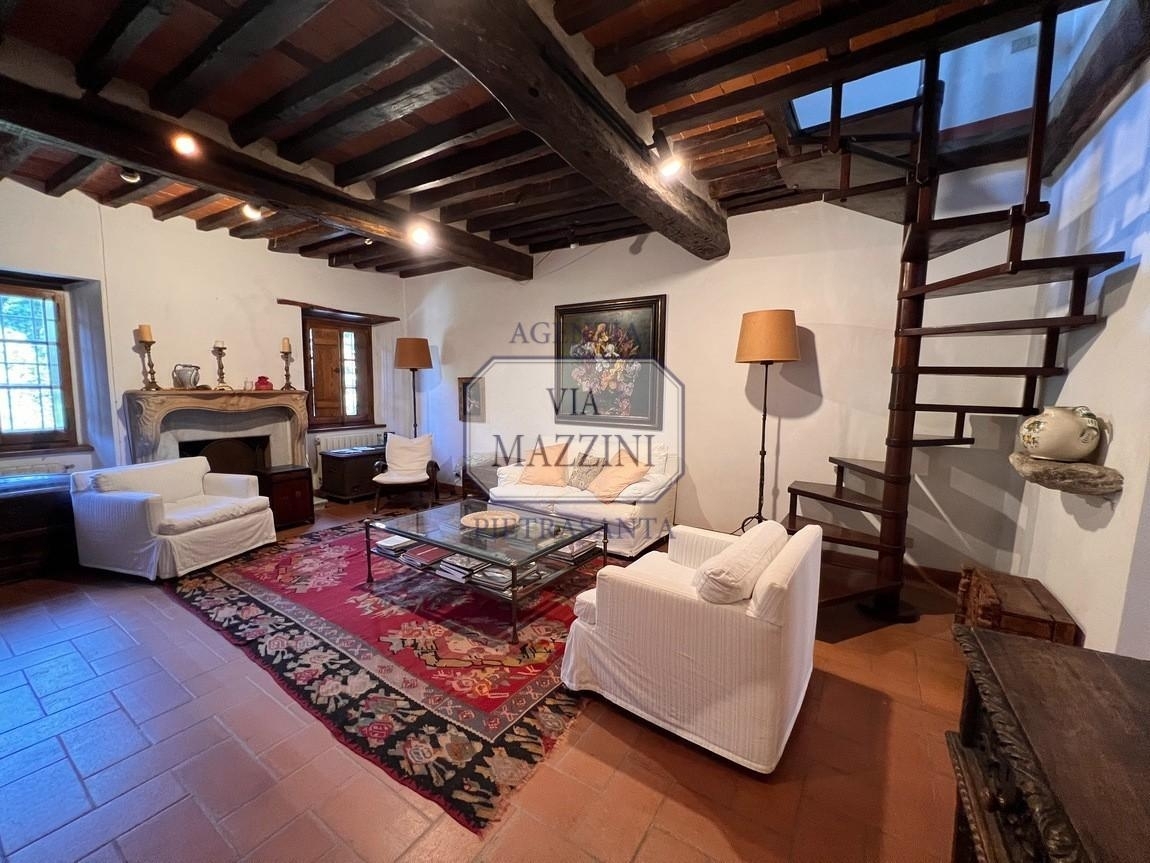 Rif: questa residenza nasce dalla passione per l'arte e dal desiderio di vivere in un ambiente sereno e riservato, pur trovandosi a pochi minuti dal centro storico. Situata nella prima collina, questa casa rappresenta un sogno comune per chi abita in città. l'immobile è un complesso composto da due edifici: la struttura principale, semi-indipendente e libera su tre lati, ma senza disturbo, si sviluppa su due piani ed è un edificio storico risalente al 1500, il cui fascino antico è stato preservato durante la ristrutturazione. completa la proprietà una seconda abitazione completamente indipendente, anch'essa su due livelli, oltre a posti auto, locali tecnici e una cantina. La casa principale accoglie dall'ampia terrazza esterna, ideale per pranzi e cene all'aperto, che conduce ad una cucina abitabile ricca di carattere e dotata di una pratica dispensa. un ambiente dall'altezza elevata è stato soppalcato per creare uno spazio aggiuntivo, perfetto per uno studio o una zona relax. Seguono un elegante soggiorno con caminetto, travi e mezzane a vista, pavimenti in cotto e soffitti alti che conferiscono luminosità e ampiezza agli spazi, oltre a un bagno. al piano superiore si trovano due ampie stanze luminose, di cui una con focolare, attualmente adibite a studio, facilmente trasformabili in due camere da letto, con un ulteriore bagno. questo piano è accessibile anche da una scala esterna privata, rendendolo ideale come appartamento indipendente rispetto al piano terra. il secondo fabbricato presenta al piano terra un ampio locale molto luminoso con uscita su un belvedere, dotato di camino, utilizzabile come studio, soggiorno o sala per ospitare feste. sempre a questo piano si trovano una stanza aggiuntiva e un bagno. al piano superiore, una terrazza coperta perfetta per la colazione all'aperto, una cucina abitabile, un soggiorno con camino, un salottino tv, due camere da letto e un bagno. la proprietà è circondata da un terreno di quasi un ettaro (9.083 mq), con dolci pendii verdi e una vista panoramica sulle colline. qui c'è spazio per realizzare una piscina e godere del giardino che, in qualsiasi stagione, offre molteplici spazi vivibili dal mattino alla sera, sia nelle giornate di sole che in quelle di pioggia.