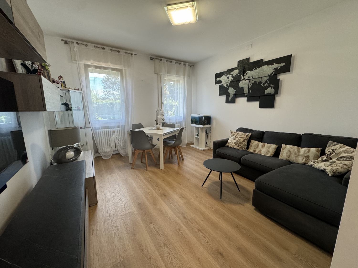 In zona residenziale e centrale al paese, bello e luminoso appartamento, recentemente rinnovato di finiture come pavimenti e infissi ma anche di impianti, disposto al piano terra con ingresso autonomo da piacevole scoperto privato con un accogliente porticato che anticipa l’ingresso, la zona giorno è composta da ampio salotto e spaziosa cucina separata, il grande disimpegno conduce alla zona notte con 2 camere grandi e bel bagno, direttamente collegato da scala interna il piano interrato composto da garage, loc. lavanderia, ripostiglio, centr. termica e cantina/taverna. Nel prezzo viene compreso l’arredo di cucina, bagno, stufa a pellets, casetta in legno, imp. d’aria condizionata e zanzariere