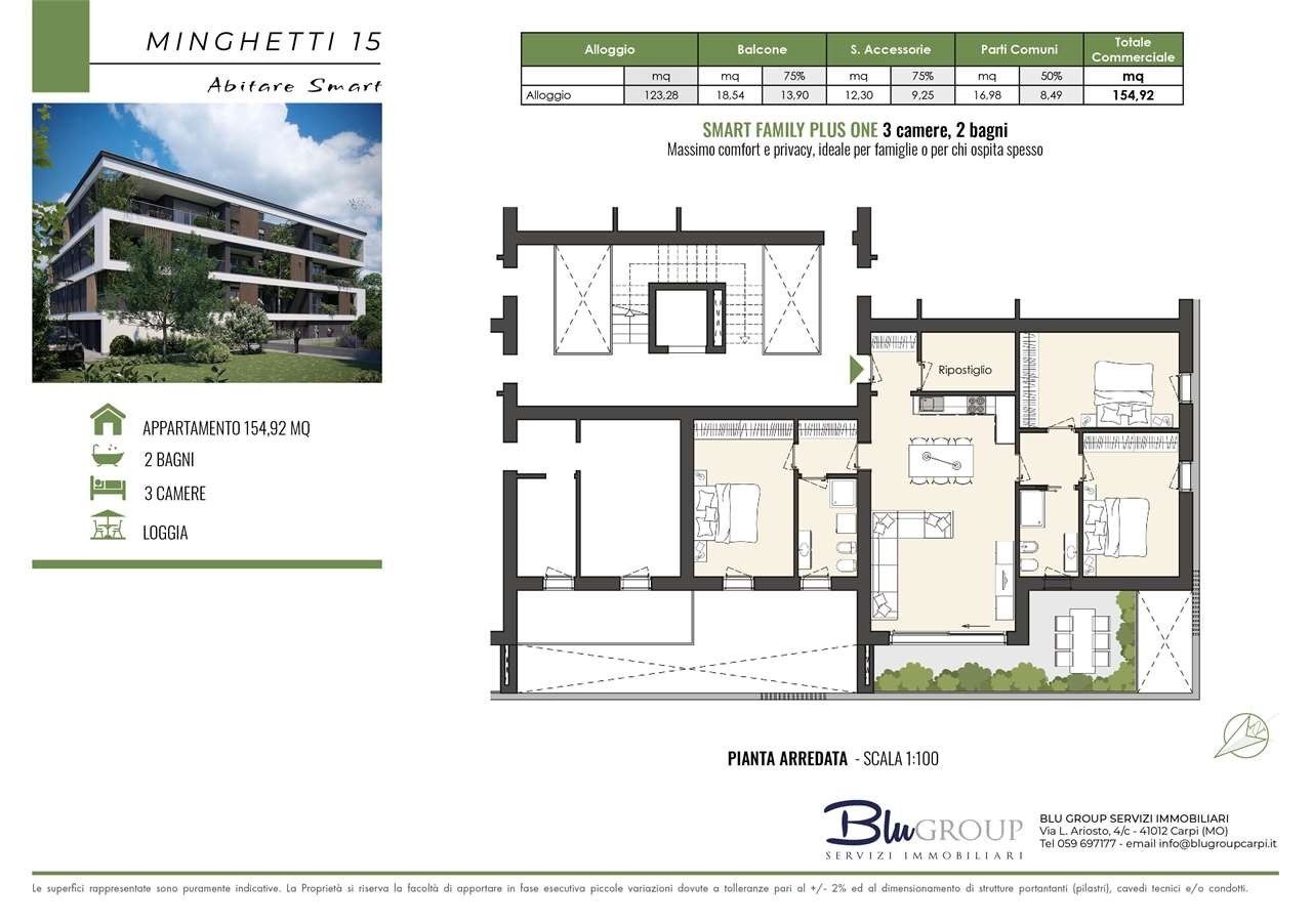 Blu group servizi immobiliari presenta in zona sud di carpi, intervento nuovo denominato 'minghetti 15 - abitare smart', prossima realizzazione di 18 unità abitative fra cui: appartamenti e attici, tutti con terrazzo loggiato, diverse tipologie disponibili e personalizzabili nelle distribuzioni interne degli spazi.possibilita' di accollo del mutuo con interessanti agevolazioni.importante detrazione fiscale:per l'attuale normativa l'acquirente potrà usufruire di un'interessante detrazione, ripartita in 10 quote annuali di pari importo, e potrà essere recuperata in dichiarazione dei redditi.possibilità di scelta fra garage di varie metrature, a partire da 19.000 euro.il design è unico nel suo genere, ideato per differenziarsi e per chi desidera abitare in un contesto urbano di gran impatto estetico. Il bosco verticale che attraversa i terrazzi sarà una peculiarità apprezzata anche dai tuoi ospiti, componente di arredo per 365 giorni l'anno!sarà presente una sala polivalente condominiale, con bagno di servizio; ideata per lo smart working di giorno, si presta ad ulteriori utilizzi.la qualità della costruzione è di alto livello con largo impiego di materiali naturali ecologici.gli impianti, in classe a++, saranno condominiali, provvisti di: sistema di riscaldamento a pavimento in pompa di calore, raffrescamento a idrosplit e impianto fotovoltaico; le murature e i serramenti interni sono ad alto grado di isolamento termico e acustico.tapparelle motorizzate e zanzariere incluse.possibilità di scelta e personalizzazione da parte dell'acquirente per le finiture interne.chiamaci per fissare un appuntamento informativo, hai ancora la possibilità di creare la casa dei tuoi sogni!!!hai un immobile da vendere o da dare in permuta? pensiamo a tutto noi, valutazione corretta di mercato e gestione vendita!per ulteriori informazioni chiedere di elena rabitti ci trovi anche su instagram e facebook, guarda le nostre recensioni!classe energetica: