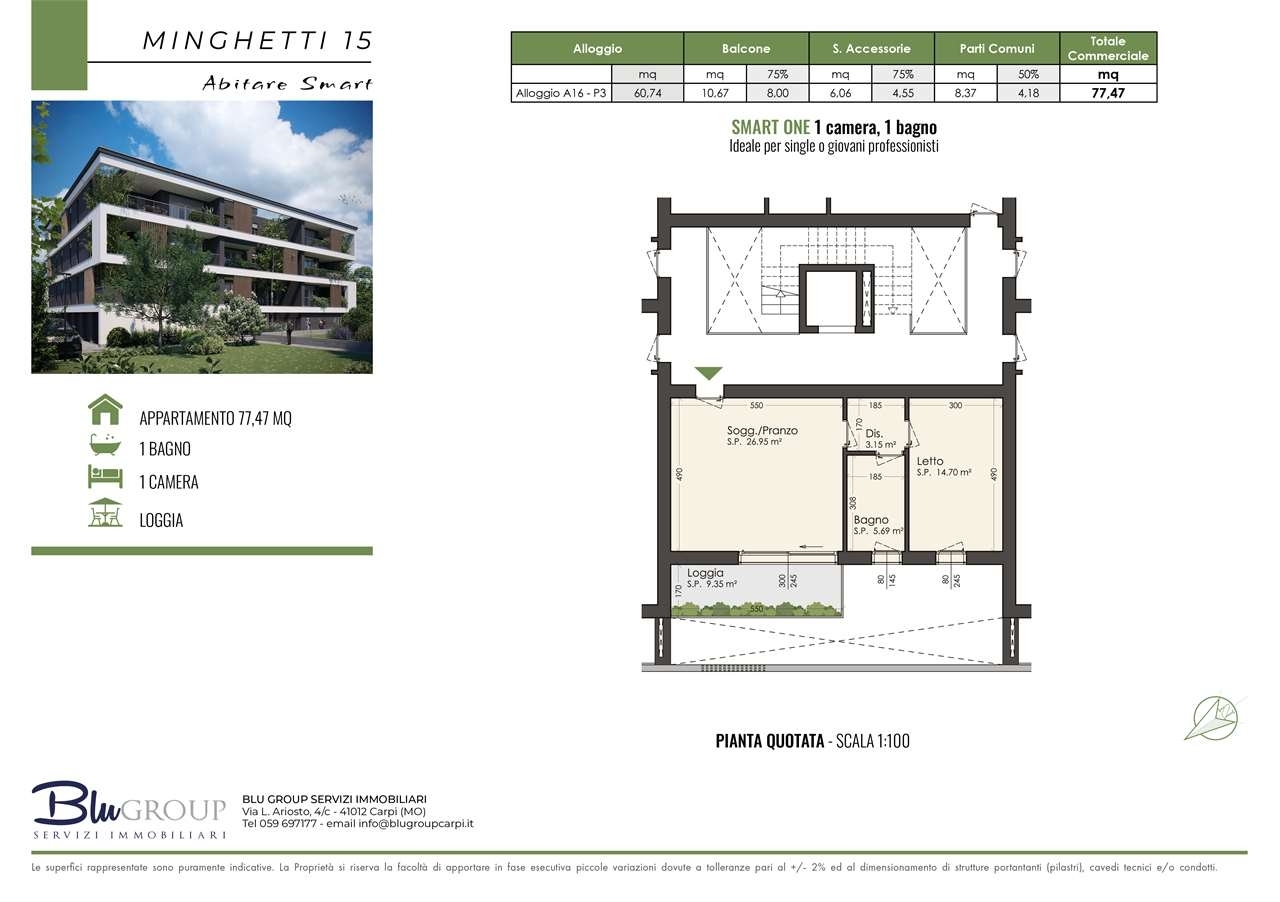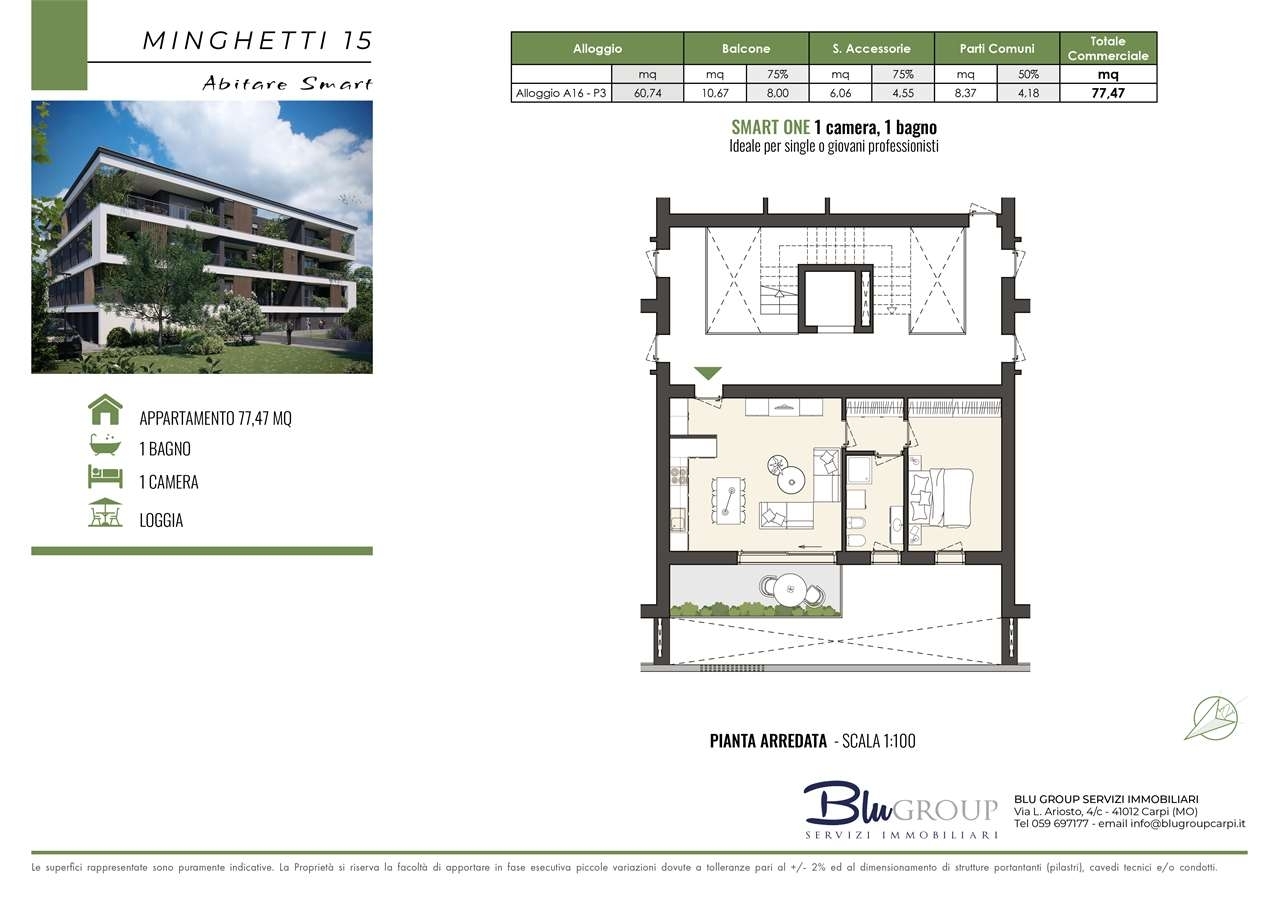 Blu group servizi immobiliari presenta in zona sud di carpi, intervento nuovo denominato 'minghetti 15 - abitare smart', prossima realizzazione di 18 unità abitative fra cui: appartamenti e attici, tutti con terrazzo loggiato, diverse tipologie disponibili e personalizzabili nelle distribuzioni interne degli spazi.possibilita' di accollo del mutuo con interessanti agevolazioni.importante detrazione fiscale:per l'attuale normativa l'acquirente potrà usufruire di un'interessante detrazione, ripartita in 10 quote annuali di pari importo, e potrà essere recuperata in dichiarazione dei redditi.possibilità di scelta fra garage di varie metrature, a partire da 19.000 euro.il design è unico nel suo genere, ideato per differenziarsi e per chi desidera abitare in un contesto urbano di gran impatto estetico. Il bosco verticale che attraversa i terrazzi sarà una peculiarità apprezzata anche dai tuoi ospiti, componente di arredo per 365 giorni l'anno!sarà presente una sala polivalente condominiale, con bagno di servizio; ideata per lo smart working di giorno, si presta ad ulteriori utilizzi.la qualità della costruzione è di alto livello con largo impiego di materiali naturali ecologici.gli impianti, in classe a++, saranno condominiali, provvisti di: sistema di riscaldamento a pavimento in pompa di calore, raffrescamento a idrosplit e impianto fotovoltaico; le murature e i serramenti interni sono ad alto grado di isolamento termico e acustico.tapparelle motorizzate e zanzariere incluse.possibilità di scelta e personalizzazione da parte dell'acquirente per le finiture interne.chiamaci per fissare un appuntamento informativo, hai ancora la possibilità di creare la casa dei tuoi sogni!!!hai un immobile da vendere o da dare in permuta? pensiamo a tutto noi, valutazione corretta di mercato e gestione vendita!per ulteriori informazioni chiedere di elena rabitti ci trovi anche su instagram e facebook, guarda le nostre recensioni!classe energetica:
