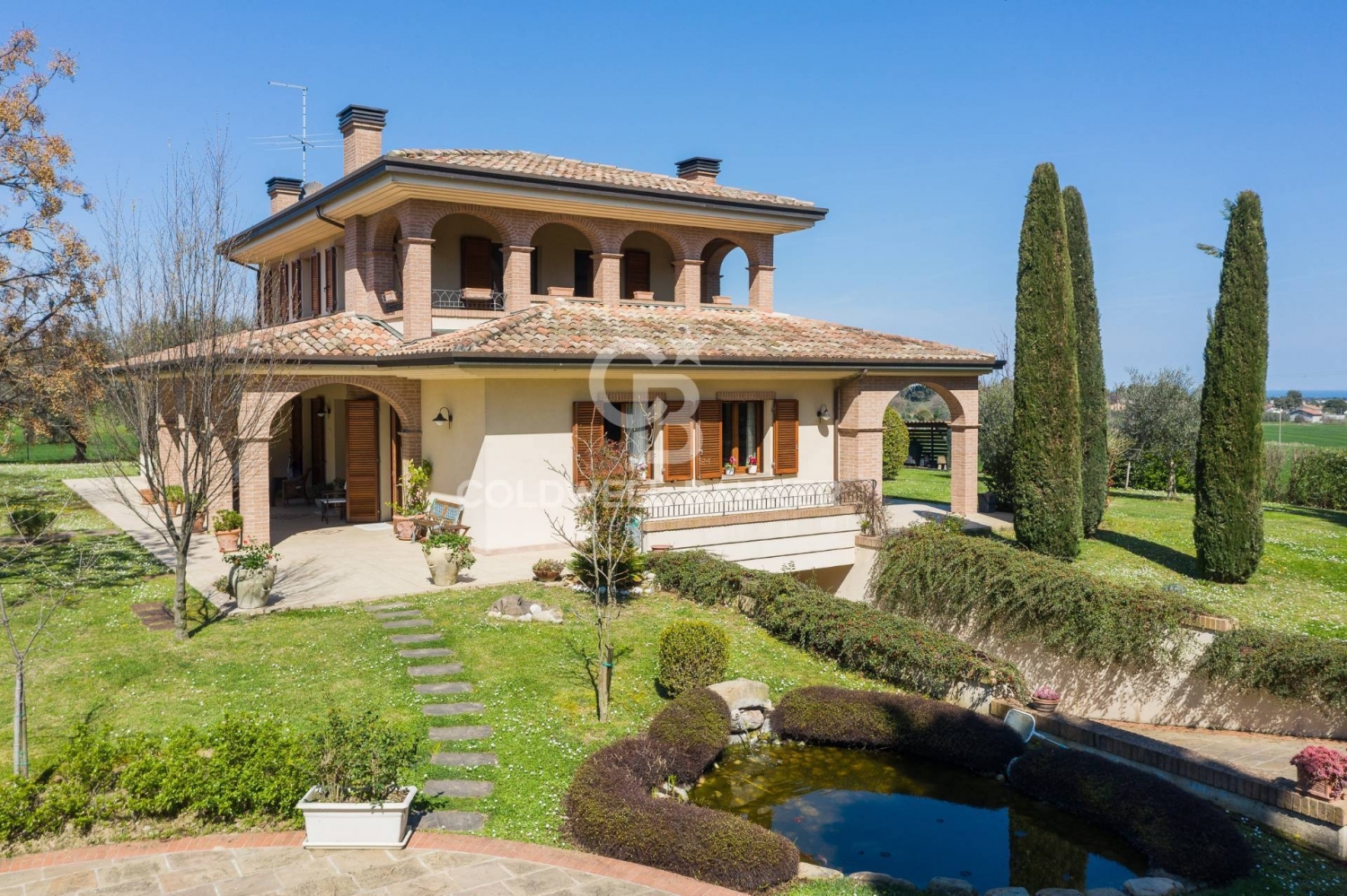 Villa di charme con loggiati e parco privato - misano monte immersa nella quiete della campagna di misano monte, in posizione riservata ma facilmente accessibile, proponiamo una elegante villa indipendente circondata dal verde, ideale per chi desidera vivere in un contesto naturale senza rinunciare al comfort.la proprietà si distingue per l'architettura raffinata, con loggiati ad arco, mattoni faccia a vista e ampie vetrate che creano una piacevole continuità tra interno ed esterno.al piano terra si sviluppa una zona giorno luminosa e accogliente, composta da soggiorno con camino e affaccio sul portico, zona pranzo, cucina abitabile separata e studio, facilmente adattabile anche a stanza ospiti.il piano superiore ospita la zona notte, con camere ben proporzionate, soffitti con travi a vista e una splendida loggia coperta con vista aperta sul verde.il piano seminterrato completa la proprietà con un ampio garage e locali accessori, ideali come cantina o taverna.all'esterno, il giardino privato circonda la villa con ulivi, cipressi e aree relax, arricchito da un suggestivo laghetto ornamentale. Il portico rappresenta una naturale estensione della zona living, perfetta per vivere la casa all'aperto.la presenza di pannelli solari contribuisce all'efficienza energetica.una soluzione ideale come residenza principale o casa di charme, che unisce eleganza, privacy e contatto autentico con la natura.