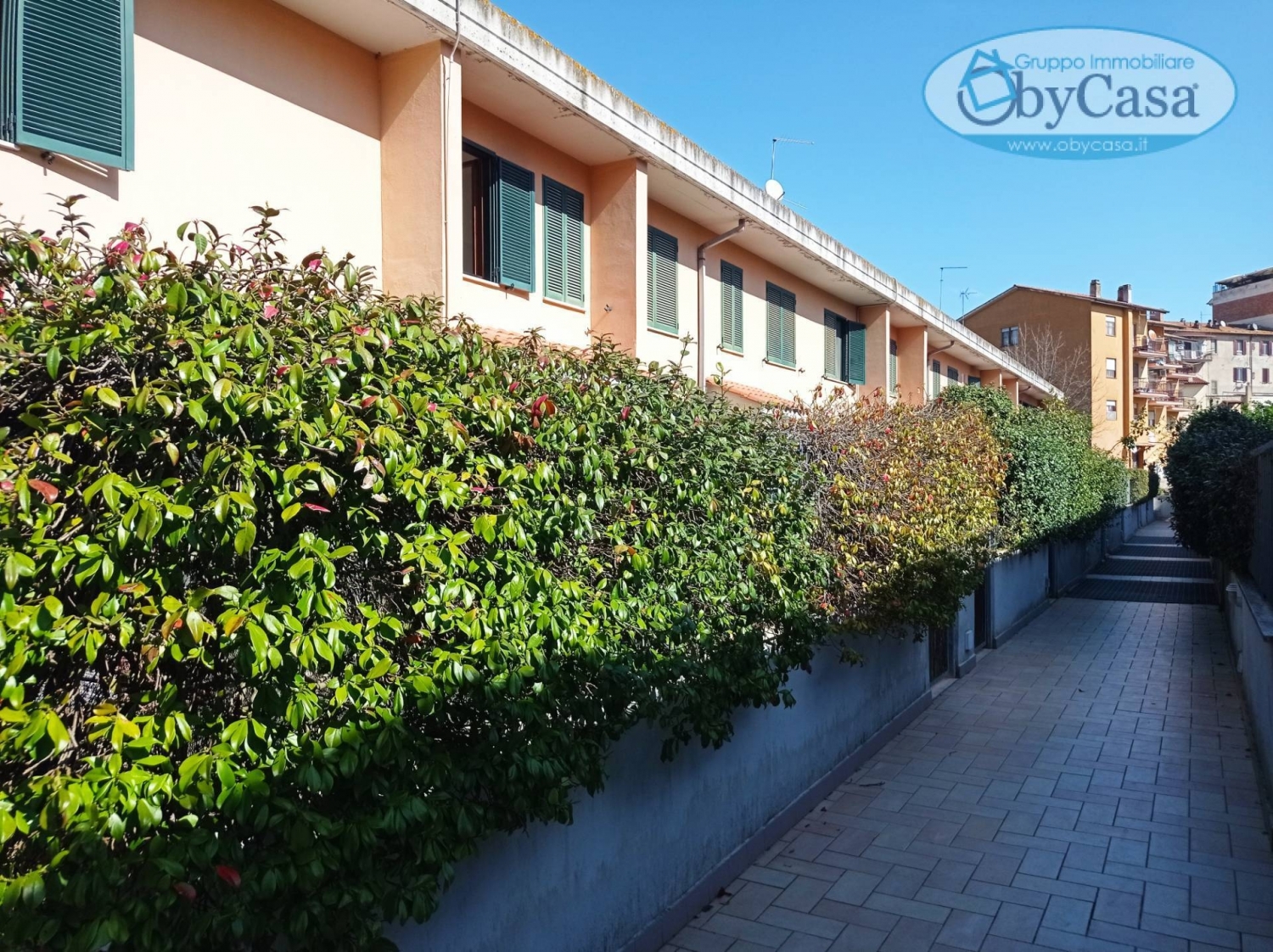 Agenzia immobiliare obycasa propone in vendita a bracciano, zona centrale, porzione centrale di villetta a schiera, 150 mq totali, di cui 140 mq calpestabili, distribuiti su tre piani.la proprietà si presenta in buone condizioni, pronta per essere abitata, e sarà consegnata libera al rogito.l'ingresso da un giardino di circa 25 mq si apre su un salone luminoso, che conduce alla cucina con uscita su giardino pavimentato e un bagno.al primo piano troviamo due camere da letto di cui una con accesso al balcone e un bagno.al piano seminterrato un box auto doppio, un magazzino e un bagno.gli infissi e le finestre, in doppio vetro alluminio, garantiscono un ottimo isolamento termico e acustico.una soluzione ideale per chi cerca una casa moderna e ben curata, in una zona centrale e comoda per raggiungere tutti i servizi.l'immobile, dotato di impianto di riscaldamento autonomo a radiatori/pannelli radianti e combustibile metano.