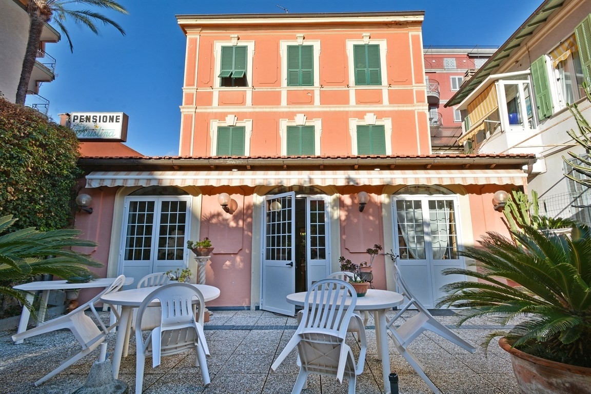 'elegante e romantica villa liberty dei primi del 900, da oltre 50 anni adibita ad attività alberghiera.nel centro di bordighera, in posizione strategica ma silenziosa, a 200 metri dalla passeggiata a mare, dalle spiagge e dalla stazione ferroviaria, comoda a tutti i servizi e alle vie dello shopping, si vende questa prestigiosa ed unica proprietà con sviluppo su 3 piani, per complessivi mq.400 circa calpestabili, oltre alle zone esterne, completa di licenza alberghiera e di ristorazione e con clientela affezionata.l'immobile dispone di doppio ingresso; è libero su tre lati, gode di affaccio sull'ampio giardino privato ed è oggi cosù composto :piano terra : ingresso su zona ricevimento, salotto con angolo bar/tv, sala da pranzo climatizzata, ampia ed accessoriatissima cucina con cella frigo, locale stireria, office, 2 camere matrimoniali e un bagno, grande giardino con ulteriori due piccoli magazzini, un ripostiglio, locale caldaia (gas) e secondo ingresso.piano primo : 5 camere matrimoniali con ampie finestrature e di cui una con terrazza esclusiva, tutte con bagno e televisore in camera.piano secondo : 5 camere matrimoniali anch'esse con ampie finestrature e tutte complete di bagno e televisore in camera.locale sottotetto : a cui si accede da una botola posizionata sul pianerottolo alla sommità delle scale.riscaldamento centralizzato mediante caldaia a gas, videocitofono, centralino, internet veloce. chiaramente le camere necessitano di lavori di ammodernamento ma la conformazione dell'immobile, che permette tra le altre cose la possibilità di installazione di un ascensore interno e la sua centralissima collocazione, proprio nel cuore di questa bellissima cittadina turistica, lo rendono il giusto investimento per chi desidera intraprendere un'attività alberghiera e/o unire la propria abitazione con un moderno bed and breakfast.la richiesta per l'immobile e la licenza commerciale è di euro 1.100.000,00'