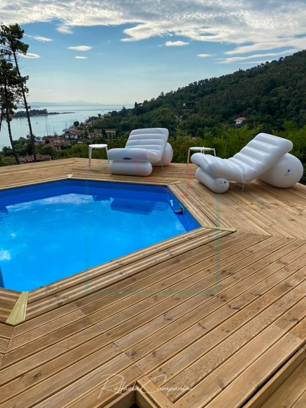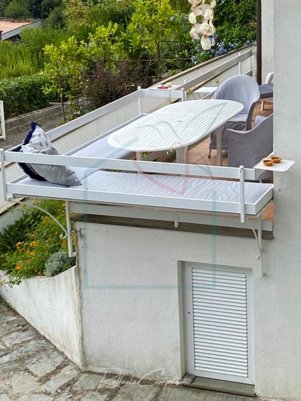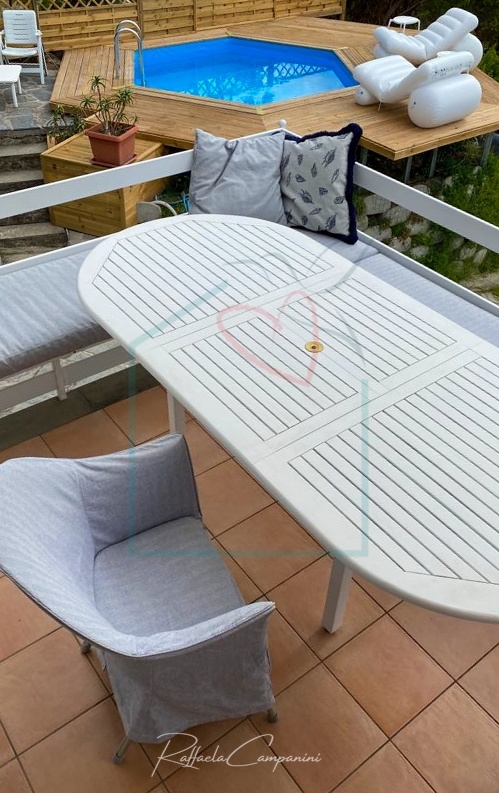 Bocca di magra. Nella prima collina di montemarcello, semindipendente distribuita su due livelli, all'interno di un complesso residenziale recintato accessibile da cancello.dalla scala esterna, attraverso la terrazza con vista panoramica su apuane, fiume magra e mare lungo la riviera da fiumaretta fino alla versilia, un doppio accesso immette al primo piano alla sala ed alla cucina, separate solo da un muretto. Dalla sala con un dislivello di pochi gradini, si arriva ad un disimpegno con soppalco affacciato sulla cucina, che, attualmente adibito a zona relax, all'occorrenza può trasformarsi in posto letto; da qui si sviluppa la zona notte con tre camere spaziose e doppi servizi finestrati con doccia e vasca. dalla sala si accede anche al piano terra, accessibile anche direttamente e quindi indipendente, dove troviamo una zona open-space attrazzata ad esere zona giorno e notte, con cucina a vista e bagno con doccia.tutto l'immobile è stato ristrutturato con rivestimenti di pregio, con cura del dettaglio e con soluzioni progettuali e di arredo di effetto e funzionali. E' provvisto di impianto di condizionamento e allarme, comandato a distanza. Ha un'ottima esposizione e all'esterno c'è un giardino terrazzato con alle spalle una pineta, una zona rialzata che ospita la piscina circolare, da cui si può godere della stessa vista panormica della terrazza, dove grazie alla creatività progettuale del proprietario, sono state adottate soluzioni particolari per le sedute e per i ripiani portaoggetti.l'ottima esposizione rende gli ambienti molto luminosi e la posizione è comoda per raggiungere le spiagge, le località turistiche di bocca di magra, lerici e tellaro, il borgo di montemarcello e le principali vie di cominicazione.