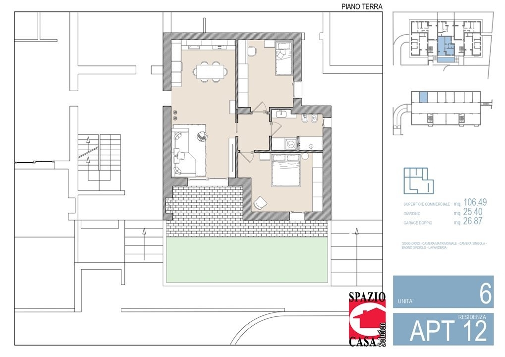 Trilocale posta al piano terra in costruenda palazzina.nclassica disposizione con soggiorno con zona cottura/pranzo e zona salotto, con prospiciente portico vivibile, due camere da letto (matrimoniale e doppia) oltre a bagno con comodo antibagno/lavanderia.npiccolo giardino di proprietà e box doppio al piano interrato. Classe energetica and quot;a and quot;.nriscaldamento e raffrescamento a pavimento autonomi, vmc (ventilazione meccanica controllata) serramenti con triplo vetro, impianto fotovoltaico 3kw , vidieocitofono, oltre a pavimenti e rivestimenti con ampia scelta di capitolato. - maggiori dettagli: climatizzato, portico, video citofono, predisposizione antifurto, insonorizzazione, porta blindata