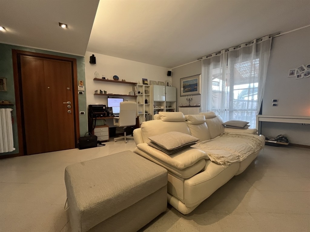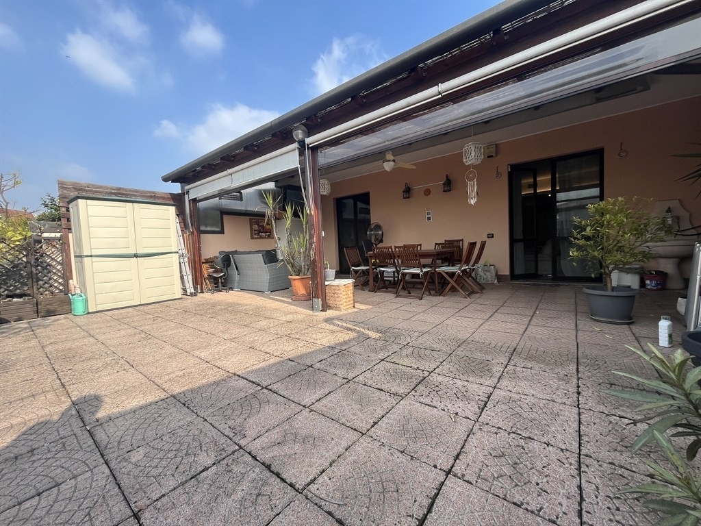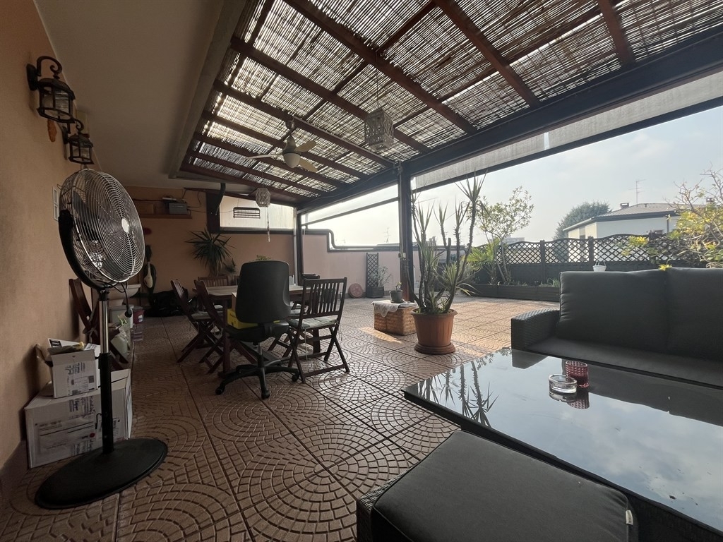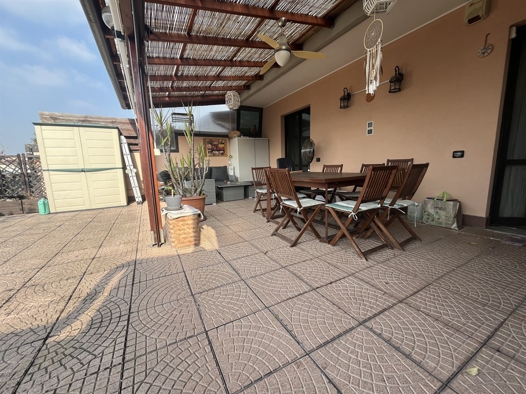 Muggiò: tre locali, in zona centrale comoda con tutti i servizi, disponiamo di attico posto all'ultimo piano ( secondo ), in contesto di minipalazzina di sole 4 unità abitative. Appartamento ristrutturato con migliorie per prestazione energetica, tra cui impianto fotovoltaico 3kw, cappotto interno tramite riempimento dell'intercapedine con insufflaggio, pompa di calore canalizzata con raffrescamento, stufa a pellet canalizzata con bocchettoni di riscaldamento in sala e cameretta oltre che fuoriuscita sul terrazzo di 75mq per riscaldare la parte chiudibile tramite tende in pvc traspareti. Inoltre l'appartamento è dotato di tende elettriche, tapparelle elettriche in acciao, impianto domotico, antifurto perimetrale e volumetrico, impianto filodiffusione audio e zanzariere. L'immobile è composto da ingresso su ampio soggiorno di 32mq con accesso al terrazzo di 75mq in parte coperto, cucina abitabile di circa 18mq con affaccio sul balcone ( il terrazzo risulta esposto ad ovest, la cucina con balcone a est ), disimpegno, 2 bagni e due ampie camere da letto. Possibilità di acquistare 2 box ad euro 18.000,00 cadauno. Rif. 4021