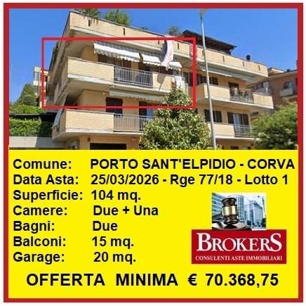 A.450porto sant'elpidio: il tribunale di fermo ha disposto la vendita in asta dei diritti di piena proprietà di appartamento e garage siti in via andrea costa, sulla frazione corva del comune di porto sant'elpidio. L'abitazione si trova al piano secondo di una palazzina con finitura esterna a mattoni faccia vista. L'accesso avviene a mezzo scala condominiale, l'appartamento ha una superficie di 104 mq. Ed è composto da ingresso, soggiorno con cucina a vista, disimpegno notte, due camere, una cameretta, due bagni e tre balconi per circa 15 mq. Al piano terra è inoltre presente un garage di 20 mq. Buone le finiture, pavimenti in gres porcellanato, finestre in legno con vetro termico, persiane in legno, riscaldamento autonomo a radiatori.immobile occupato. rgei 77/2018 lotto uno.foto visionabili in ufficio previo appuntamento.per informazioni ed assistenza per la partecipazione in asta, brokers immobiliare civitanova marche mail: appartamento piano secondo mq. 104 + balconi mq. 15 + garage mq. 20. l'immobile è sottoposto a procedimento esecutivo n lotto uno, presso il tribunale di fermo.offerta minima di partecipazione euro 70.368,75(prezzo base d'asta euro 93.825,00 ) - rilancio minimo euro 1.000,00valore di mercato stabilito in perizia dal ctu euro 167.000,00data asta ore 10:00 alle ore 12,00 del 27/03 asta: asincrona telematicale informazioni indicate sono quelle riportate nel sito del tribunale di competenza, a cui si fa esplicito rinvio per ogni dettaglio.l'acquisto di un immobile all'asta permette di ottenere un cospicuo risparmio rispetto al prezzo di mercato e lo si può fare in piena tranquillità.forniamo assistenza alla nostra clientela per cercare la migliore soluzione alle proprie esigenze, dalla ricerca dell'immobile alla partecipazione all'asta, fino all'effettiva consegna.in ufficio, previo appuntamento conoscitivo e non impegnativo, siamo a disposizione per fornirvi ogni informazione, chiarimento o dubbio possiate avere, su come partecipare ad un'asta giudiziaria e sulle opportunità disponibili.contatti brokers immobiliare: cell. tel classe energetica: non dichiarata