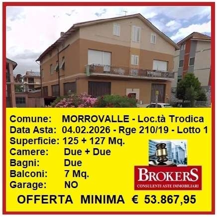 A.439morrovalle: il tribunale di macerata ha disposto la vendita per i diritti di piena proprietà su unità abitativa in casa bifaliare, sita a morrovalle in via d. Alighieri, località trodica. Oggetto di vendita è un appartamento disposto su due livelli, piano primo e sovrastante mansarda sottotetto. Con scala comune si accede al primo piano della superficie di mq. 125 dove troviamo l'ampio ingresso, soggiorno, sala da pranzo con cucinino separato, corridoio, due camere matrimoniali ed il bagno, oltre ad un balcone di mq. 7 e, con scala interna si accede al piano superiore mansardato di mq. 127, in cui si trovano un soggiorno-cucina, tre stanze ed un grande bagno. Le finiture sono di buon livello, pavimenti in parte in marmo ed in parte in gres, scala interna in marmo bianco, porte in legno tamburato e finestre dotate di avvolgibili.immobile occupato. procedura n lotto uno. foto e planimetrie disponibili in ufficio su appuntamento.per informazioni ed assistenza alla partecipazione in asta brokers immobiliare civitanova marche mail: abitazione piano primo mq. 125 + balconi mq. 7 + mansarda mq. 127. l'immobile è sottoposto a procedimento esecutivo n lotto uno, presso il tribunale di macerata.offerta minima di partecipazione euro 53.867,95(prezzo base d'asta euro 71.823,93 ) rilancio minimo euro 3.000,00valore di mercato stabilito in perizia dal ctu euro 227.000,00data asta ore 11:00 asta: sincrona le informazioni indicate sono quelle riportate nel sito del tribunale di competenza, a cui si fa esplicito rinvio per ogni dettaglio.l'acquisto di un immobile all'asta permette di ottenere un cospicuo risparmio rispetto al prezzo di mercato e lo si può fare in piena tranquillità.forniamo assistenza alla nostra clientela per cercare la migliore soluzione alle proprie esigenze, dalla ricerca dell'immobile alla partecipazione all'asta, fino all'effettiva consegna.in ufficio, previo appuntamento conoscitivo e non impegnativo, siamo a disposizione per fornirvi ogni informazione, chiarimento o dubbio possiate avere, su come partecipare ad un'asta giudiziaria e sulle opportunità disponibili.contatti brokers immobiliare: cell. tel classe energetica: non dichiarata