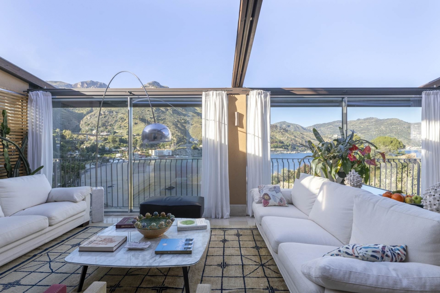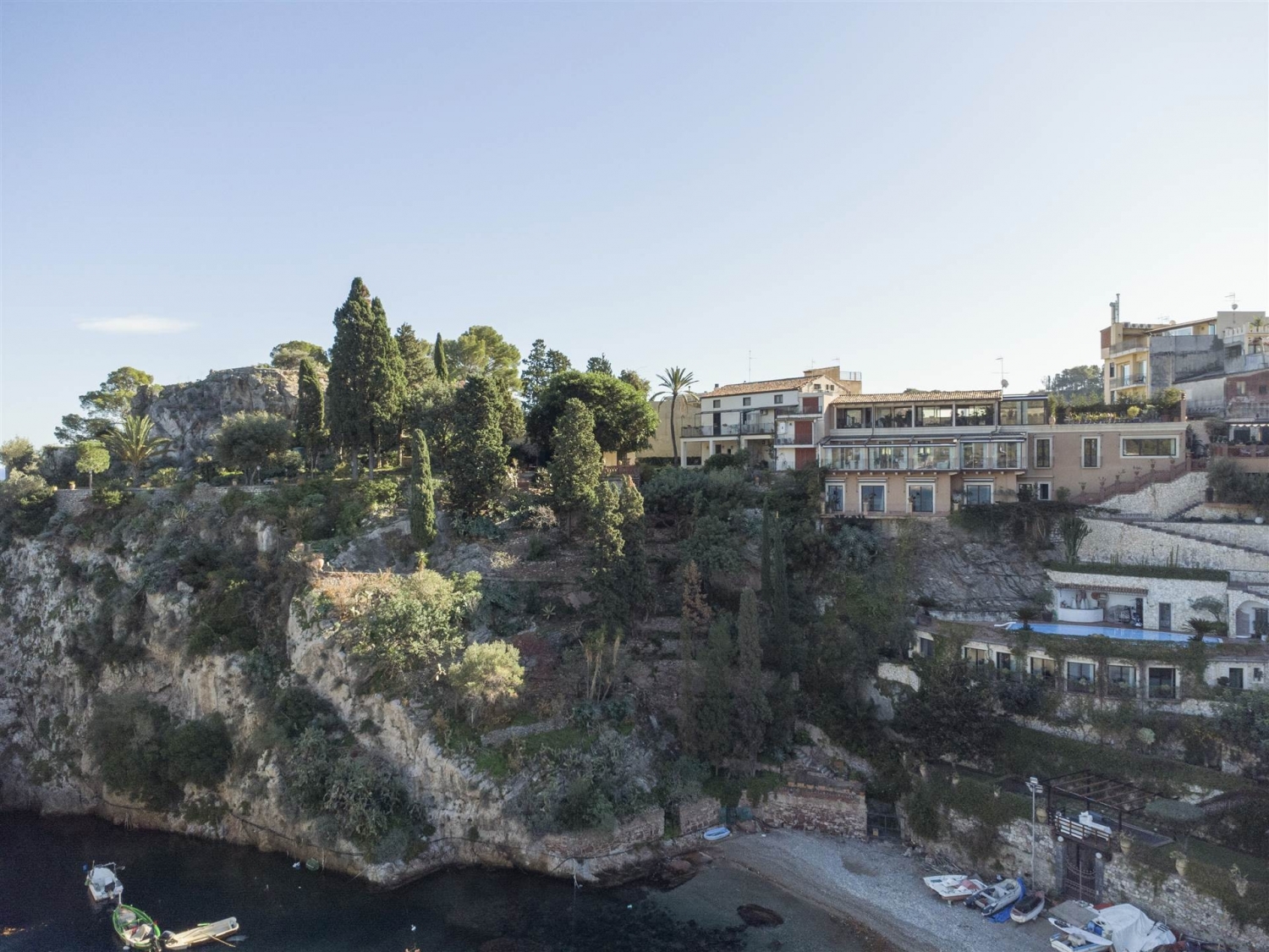 A taormina luogo simbolo del turismo in sicilia, si trova questa splendida villa di lusso in vendita, in posizione esclusiva e panoramica a picco sul mare. costruita sul monte tauro, direttamente sulla baia di s. Nicola, la più bella e riservata di taormina, che fu anche il primo approdo romano, si erge villa margherita, una favolosa proprietà immersa nel verde della vegetazione e nel blu intenso del mare. la villa fu costruita a metà dell'800 , e successivamente nel '900 di proprietà dell'amministratore generale della ducea di bronte, colui che da questa villa amministrava le proprietà dell'ammiraglio nelson si tratta di una dimora storica resa ancor più affascinante e lussuosa dallo scrupoloso intervento di restauro dell'architetto bambara, con un cantiere durato tre anni, sotto la sorveglianza della soprintendenza dei beni culturali e ambientali di messina, sia per la parte paesaggistica che archeologica.il restauro della villa ha consentito di recuperare le parti storiche, dando nuova vita a questa dimora sul mare, con 1.000 mq di parco a terrazzamenti, piscina e parcheggio privato. La villa si sviluppa su tre livelli, tutti esposti sul mare con una vista a 360°.il livello principale si compone di un ingresso con grande vetrata panoramica che crea un continuum tra interni ed esterni.un corridoio conduce alla zona di rappresentanza, caratterizzata da un ampio living con zona pranzo, in continuità con un grande giardino d'inverno direttamente sul mare con grandi finestre scorrevoli e tetto di copertura apribile che rende magica l'atmosfera di questa villa. Da qui si accede alla splendida cucina realizzata da boffi. Questo livello è servito da un bagno di rappresentanza di grande impatto estetico.un'ampia scala in legno e ghisa realizzata su disegno conduce al livello superiore, caratterizzato da grandi vetrate che rendono l'intero piano molto luminoso. Questo piano è composto da studio, camera da letto con bagno, zona fitness ed ampio terrazzo a livello.la scala conduce a un ulteriore livello dedicato alla zona notte, composta da un'ampia camera padronale con angolo studio, cabina armadio, bagno con vasca, doccia e terrazzo fronte mare di grandi dimensioni. Allo stesso livello troviamo un ulteriore camera da letto con bagno en suite e spazi di servizio dedicati a stireria, lavanderia e ampi ripostigli. gli interni della villa hanno impianto radiante a pavimento, pavimento in listoni di quercia francese anticato, boiserie e porte interne bugnate di legno realizzate da abili artigiani locali.passeggiando nel parco esterno che discende verso il mare, incontriamo la piscina con grande terrazzamento attrezzato con zona bar, zona wellness e bagno con doccia a servizio della piscina. il percorso che porta verso la spiaggia ci conduce a due dépendance; la prima, un appartamento ricavato nella roccia, è caratterizzato da un living con cucina e due camere da letto con bagno, tutti affacciati sul mare; la seconda dépendance è totalmente indipendente, caratterizzata da una zona giorno e una camera da letto con terrazzino. Continuando la passeggiata nel parco verso il mare, si incontrano ulteriori terrazzamenti a verde con zone d'ombra e gazebo perfetti per godere al pieno degli spazi esterni e della suggestiva vista mare. Classe energetica: a2
