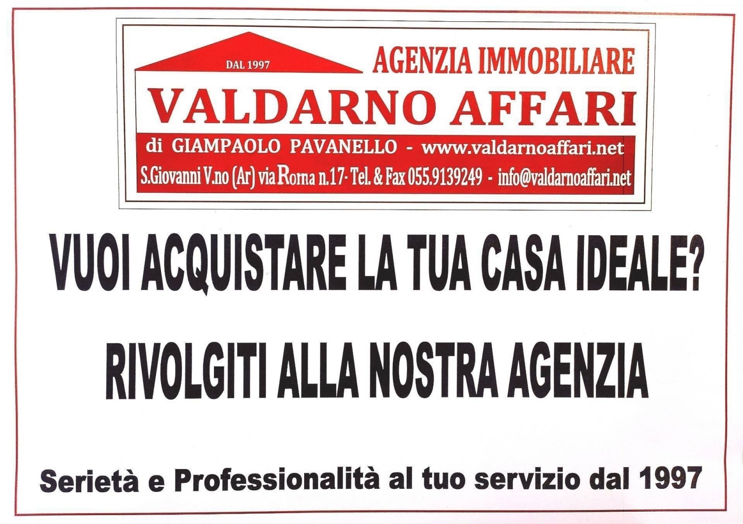 Montevarchi zona stadio affittiamo fondo artigianale/magazzino di c.a. 130 mq con servizio e piccolo piazzale. Buone condizioni. Euro 650,00 mese.l'agenzia immobiliare valdarno affari nasce nel 1997 e si è sempre distinta nel corso degli anni per la sua professionalità e affidabilità. La nostra agenzia offre ai propri clienti un servizio completo a 360°, tra cui intermediazioni per compravendite e affitti di beni immobili abitativi, commerciali, artigianali, etc; consulenza tecnica, notarile e finanziaria; pratiche per mutui; stime; permute; consulenze immobiliari; vendita di immobili di pregio (in collaborazione con agenzie straniere); vendita di nude proprietà; assistenza totale fino all'atto.