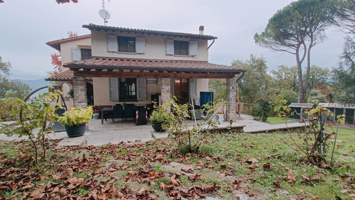 Tra borgo san lorenzo e vicchio, in posizione dominante, soleggiata e panoramica, si vende villa libera su quattro lati con giardino circostante (4.000 mq), garage, logge e terrazzo. Si accede alla villa dai cancelli privati, carrabile e pedonale ed un vialetto ci porta al garage ed all'ingresso. Sul lato est ci sono le 2 logge: una sopra il portone d'ingresso (5 mq) ed una abitabile di 27 mq collegata da portafinestra al cucinotto. La loggia può essere chiusa con vetri scorrevoli. Si entra nel luminoso ed ampio salone con 3 finestre a sud ed ovest, un camino chiuso a legna ed una stufa a pallets, ad est c'è la zona pranzo ed il cucinotto collegato alla loggia abitabile, a nord troviamo il servizio con finestra, il ripostiglio e la scala interna di accesso al piano seminterrato. Dal soggiorno saliamo nella zona notte, con 4 camere matrimoniali ed il secondo servizio sempre finestrato. Il piano seminterrato è composto dal grande garage completamente fuori terra, il vano tecnico con la caldaia a gasolio sempre fuori terra e due ampi vani ad uso sbratto interrati ma con scannafosso. Ottimo stato di mantenimento, rifiniture di pregio. Tetto con guaina e coibentazione, la loggia abitabile è di recente costruzione. La fornitura dell'acqua è da acquedotto pubblico. La villa ha ampia privacy, ma non è isolata; la strada di accesso è completamente asfaltata, percorribile con ogni mezzo. La proprietà è totalmente recintata, gli alberi presenti sono curati e controllati. Possibilità d'installare una piscina fuori terra. Superfici abitazione piano terra e primo 190 mq s.u.l., piano seminterrato, locali di sbratto e cantina 31 mq s.u.l., terrazzo (20 mq), logge 27 mq e 5 mq, garage (30 mq), giardino (4.000 mq). Per motivi di privacy gli indirizzi degli immobili sono approssimativi. classe energetica: g