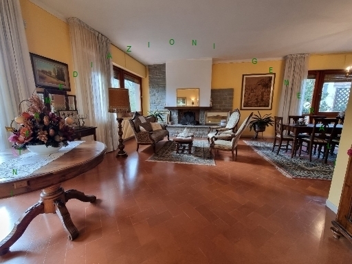 Paese, appena fuori il centro storico, in ottima zona vicina a tutti i servizi villa libera su quattro lati e su due livelli e composta da al piano terra da ampio garage, vari locali uso sgombero, disimpegno, due bagni, locale uso lavanderia due ripostigli; al piano primo troviamo l'abitazione composta da ampio ingresso, disimpegno, due bagni, tre camere matrimoniali, cucina abitabile, ampia zona pranzo con camino e salone doppio con camino oltre a ampia terrazza sui tre lati dell'abitazione e soffitta. Completa la proprieta' un giardino esclusivo di 1300mq con piscina di 4x8 metri e alta 1.5mt. La proprieta' e' dotata di tre accessi pedonali e due carrabili. In buono stato l'immobile e' ideale per chi abbia bisogno di fare attivita' e abitazione oppure per due nuclei familiari (agg )