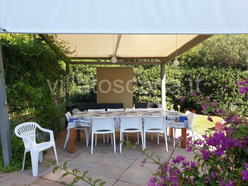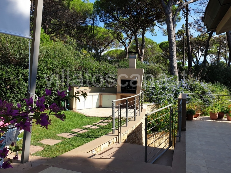 Nella bellissima 'pineta di roccamare' alle porte di castiglione della pescaia, una villa già ristrutturata, pronta ad essere abitata.la posizione è ottimale, centrale e non distante dal mare, dove abbiamo sulla spiaggia una tettoia in bambù ed un capanno come spogliatoio assegnati per tutto l'anno ad uso esclusivo.si tratta di metà di una bifamiliare ben separata, libera su tre lati, terra-tetto e con privacy assoluta.disposta su 2 livelli con di fatto due appartamenti collegati con scale interne, ma comodamente accessibili tutti i due anche dall'esterno attraverso due ingressi indipendenti e la corte dedicata.totale 5 camere da letto e 6 bagni più 1 camera esterna con bagno, oltre soggiorno, saloni, cucine e stanze di servizio.aria condizionata al piano superiore e mansarda, attacco tv e wi-fi in tutte le camere. Camino a legno sia piano inferiore che pianoterra.pannelli solari sul tetto con accumulatore serbatoio di 500 lt acqua calda, più autoclave con serbatoio di 5000 lt di acqua fredda.riscaldamento a gpl con serbatoio interrato di 2500 lt.bellissimo giardino molto curato, completamente recintato parte anche con filo elettrico. Pergola e barbecue, 2 docce esterne con acqua calda/fredda.