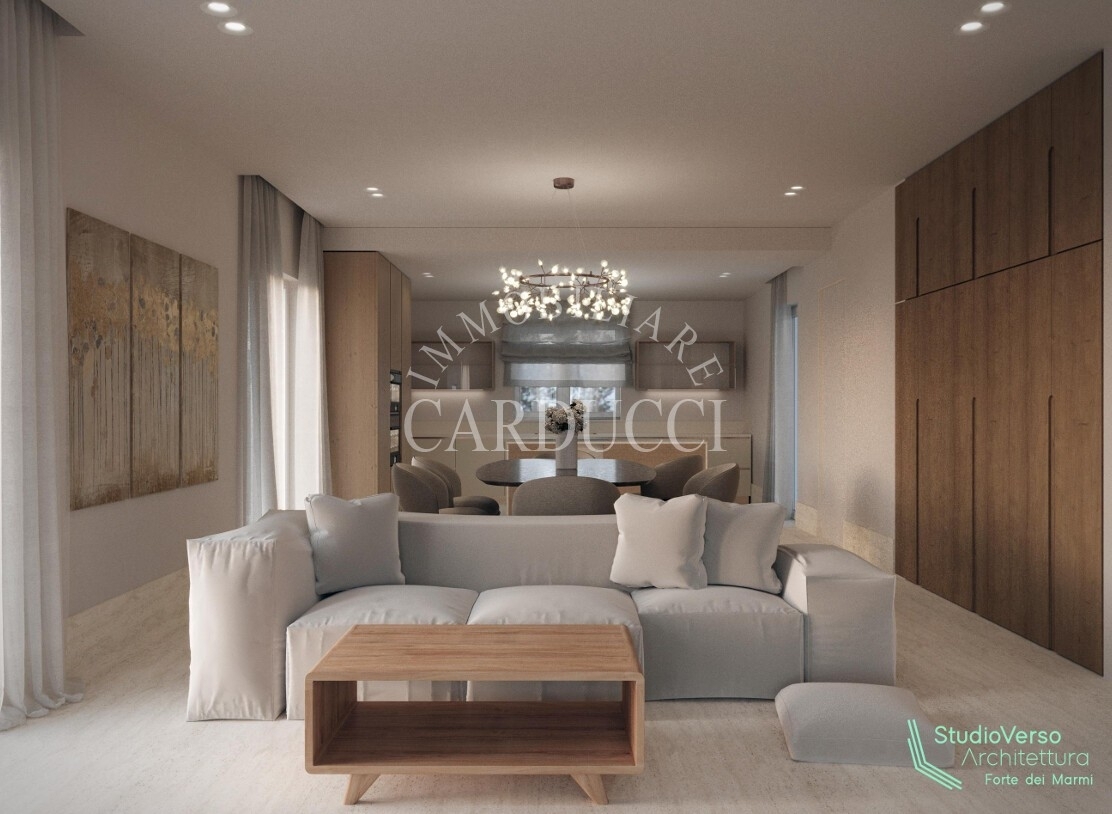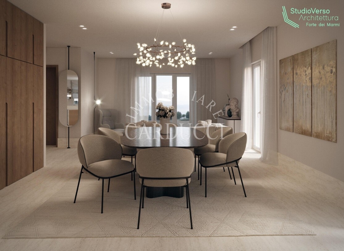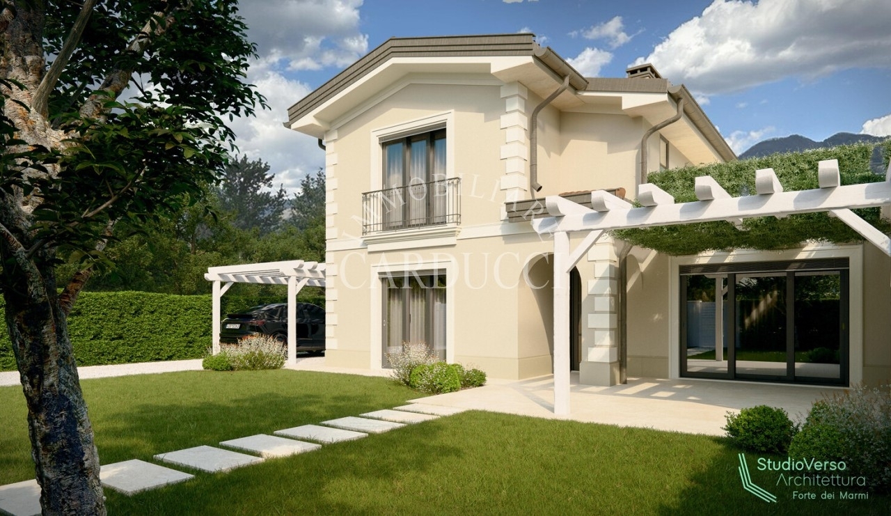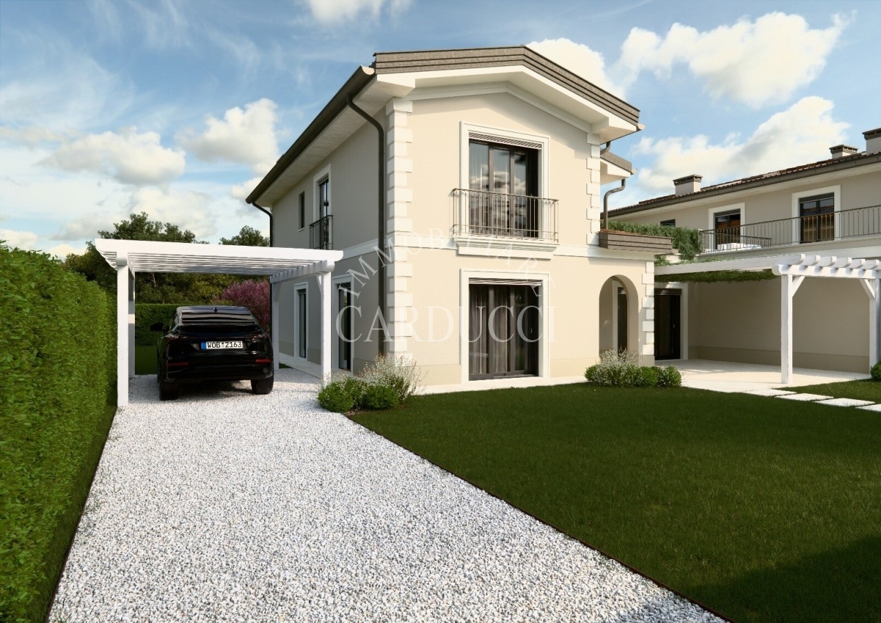 La villa, sviluppata su due piani per una superficie di circa 160 mq, unisce funzionalità e armonia architettonica. Il piano terra, leggermente rialzato rispetto al giardino - con un dislivello di appena un gradino - si presenta come un ampio open space illuminato da numerose aperture che creano un dialogo continuo con il verde circostante. Lo spazio principale, concepito per la convivialità, accoglie una cucina moderna con isola centrale, un'area dedicata ai pasti e una zona living, mentre due pergole esterne - una adiacente alla cucina e l'altra verso la sala - definiscono aree relax all'aperto senza interrompere la fluidità degli interni. Dall'ingresso, protetto da un portico coperto, si accede a un pratico armadio d'ingresso e a un bagno guest, affiancati da uno spazio polifunzionale di 20 mq e dal vano tecnico, collocati in posizione discreta ma accessibile direttamente dall'esterno. Una scala conduce al piano superiore, riservato alla privacy: qui tre camere e due bagni, caratterizzati da linee essenziali, sono collegati a una terrazza che offre una vista suggestiva sul paesaggio, ideale per momenti di quiete tra cielo e natura. Ogni dettaglio è studiato per valorizzare gli spazi vivibili: dalla disposizione razionale degli ambienti alla scelta di aperture generose che esaltano il contatto con il giardino, fino alla doppia pergola che trasforma gli esterni in prolungamenti naturali degli interni.