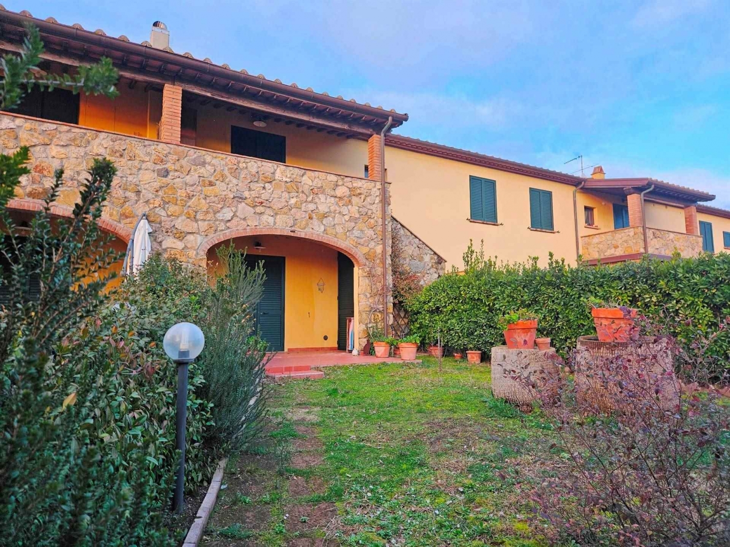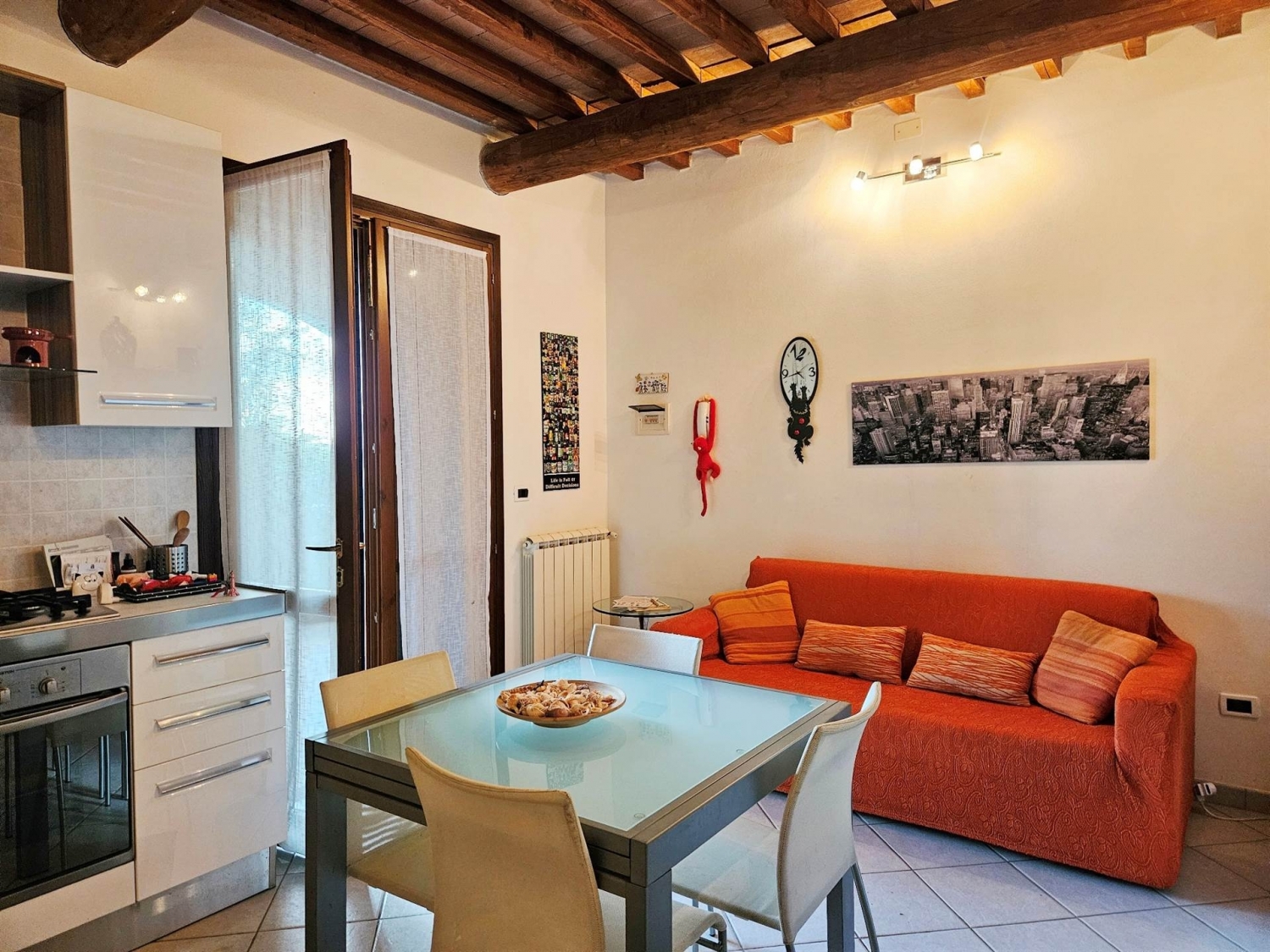 Pomaia, 14 km dal mare, in aperta campagna, nella totale quiete, con ampia vista panoramica, in antico casale ben restaurato, vendesi appartamento indipendente di 45 mq. Piano terra: pranzo soggiorno con angolo cottura e accesso diretta ad ampio loggiato, camera e bagno; ripostiglio lavanderia. Ampio giardino privato. Due posti auto. Piscina con ampio solarium e parco condominiale. Classe energetica: g