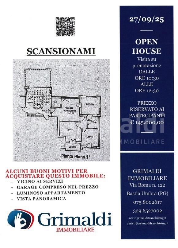 Appartamento in zona centrale e ben servita. All?interno la soluzione è cosù composta: ingresso, soggiorno con angolo cottura, due camere da letto e bagno finestrato. Completa la proprietà balcone abitabile di 15 mq con vista su assisi, posto auto e ampio garage. Libero da subito. prezzo riservato ai soli partecipanti. visite su prenotazione tramite mail o whatsapp