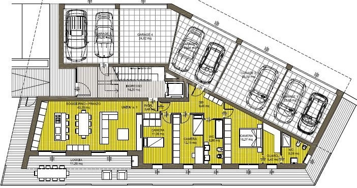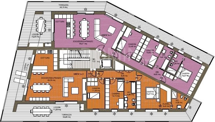 San domenico, ultimo appartamento rimasto. Attico nuovo posto al piano secondo, ultimo piano, di una palazzina di due piani e di cinque unità, dalle linee moderne, edificato con i migliori accorgimenti costruttivi e le più recenti tecnologie per conferire all'immobile una elevata capacità di risparmio energetico e una ottimale vivibilità e tranquillità. L'appartamento è composto da un'elegante e ampia sala di 50 mq. Con cucina open space, tre camere, un guardaroba, due bagni, entrambi finestrati, un terrazzo avvolgente di 70 mq. Accessibile sia dalla zona giorno sia dalle camere. Il garage doppio è situato al piano terra. Oltre al garage l'appartamento dispone di un posto auto. i muri esterni sono di 50 cm., mentre quelli divisori con le altre unità sono di 31 cm.; i solai sono di 63 cm.; le tapparelle sono in alluminio e sono coibentate e motorizzate, come pure il basculante del garage; il portoncino di ingresso è in classe 3 antieffrazione ed è dotato di un doppio cilindro a profilo europeo. Ogni appartamento ha il riscaldamento autonomo a pavimento con doppia alimentazione, comandata da computer, da impianto fotovoltaico e caldaia a gas, l'impianto di pannelli solari, l'impianto di allarme perimetrale e volumetrico e la ventilazione meccanica controllata. L'immobile è certificato in classe energetica a4. L'attico in oggetto è colorato in viola nella pianta.