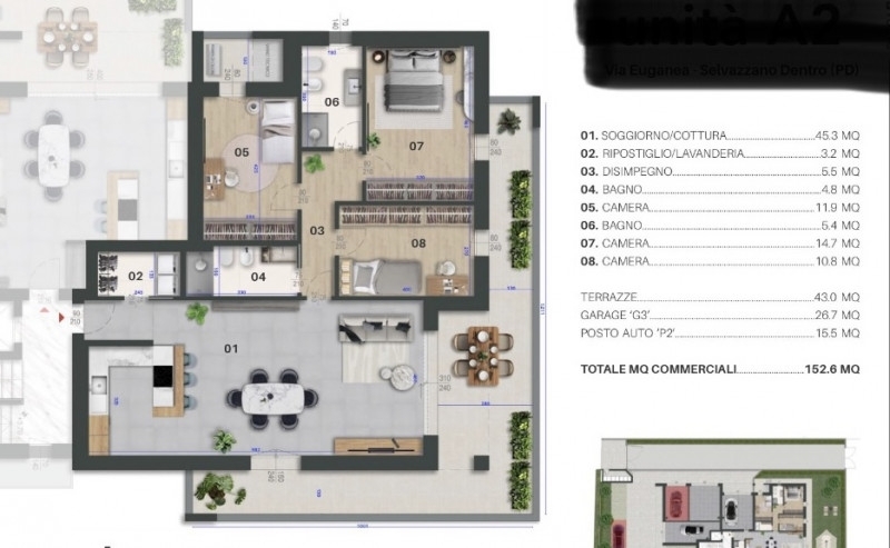 (per info cristina ) a selvazzano dentro, nella tranquilla zona residenziale del quartiere san domenico, situato in posizione strategica estremamente comodo a tutti i servizi e mezzi di trasporto, proponiamo in vendita un appartamento di 152mq commerciali, al primo piano di 2, in elegante palazzina moderna con ascensore di sole 4 unità in fase di costruzione (consegna fine 2026). Elemento caratterizzante della costruzione: classe a4, studiata per alto risparmio energetico, materiali tecnologici, luminosità, vivibilità e ottima gestione degli spazi interni. L'appartamento è composto da: ingresso con con comodo ripostiglio/lavanderia, zona giorno open space di 45 mq a sud con grandi vetrate sul terrazzo molto ampio, 3 camere a scalare tutte con uscita ai terrazzi, 2 bagni. Dispone di riscaldamento a pavimento, sistema di climatizzazione, tapparelle motorizzate, ventilazione meccanica controllata. Garage e posto auto interno. Possibilità di scelta delle finiture da prestigioso capitolato. Consegna fine 2026. Rif. A7349nb siamo alla ricerca di immobili residenziali in vendita in zona per nostri clienti referenziati per i quali è già stato deliberato il mutuo, non è richiesta alcuna esclusiva, rimaniamo a disposizione per un sopralluogo, contattateci senza impegno.i dati e le informazioni contenute nel presente annuncio hanno valore puramente indicativo e non costituiscono elemento, vincolo o presupposto contrattuale. Tutte le misure eventualmente riportate devono considerarsi indicative.a tutela della privacy del proprietario, l'indirizzo indicato potrebbe non corrispondere alla reale ubicazione dell'immobile, ma trovarsi nelle immediate vicinanze e godere sostanzialmente degli stessi servizi.