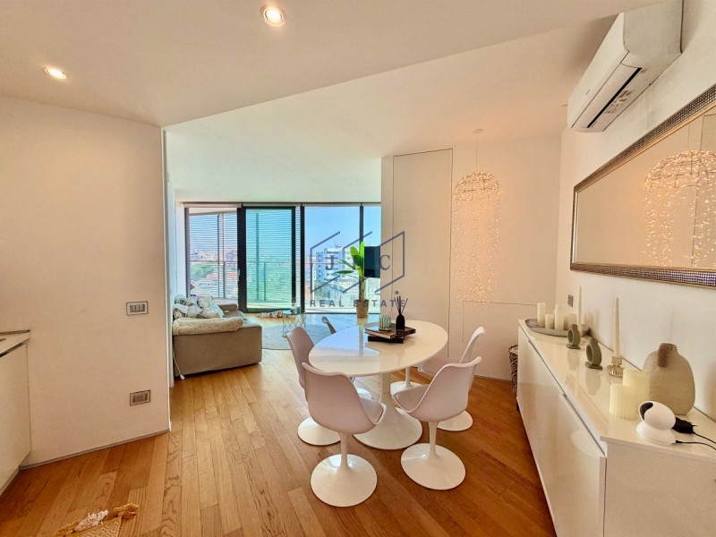 Nel cuore di torre aquileia, in posizione esclusiva su piazza mazzini, proponiamo in vendita un raffinato appartamento al 5° piano di un condominio di prestigio, moderno e curato in ogni dettaglio.l'abitazione accoglie con un luminoso soggiorno con cucina open space, uno spazio conviviale e contemporaneo impreziosito da splendide vetrate a tutta altezza che regalano luce naturale per l'intera giornata. Da qui si accede a un'ampia terrazza, ideale per pranzi all'aperto, momenti di relax o per godere della vista e dell'atmosfera esclusiva della zona.la zona notte comprende una camera matrimoniale, una camera singola e un bagno funzionale e ben rifinito, perfetti per garantire comfort e praticità sia come prima casa sia come residenza vacanze.completa la proprietà un ampio e funzionale garage situato al piano seminterrato, ideale per ospitare comodamente auto di diverse dimensioni e offrire ulteriore spazio per deposito o uso cantina.il contesto condominiale offre servizi di alto livello, tra cui piscina riservata ai residenti, sicurezza e ambienti comuni curati, per uno stile di vita all'insegna del benessere e della tranquillità.una soluzione unica, perfetta per chi desidera vivere o investire in un immobile di charme, in una delle zone più richieste ed esclusive.