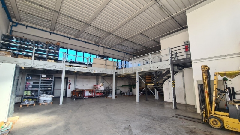 Capannone di 500 mq con soppalco e uffici, altezza 7,5 m.la zona produttiva è sviluppata su un'unica campata.portone a livello con apertura scorrevole di 4 x 4,5 m.aree esterne ad uso esclusivo di 210 mq.l'immobile è cosù suddiviso:laboratorio 105 mq (piano terra), magazzino 245 mq (145 mq piano terra e 100 mq piano primo), uffici 145 mq (57 mq piano terra e 88 mq piano primo)ampio parcheggio pubblico esterno.struttura del capannone:plinti gettati in opera, pilastri e architravi prefabbricati in cemento armato.copertura a cupoline con travi prefabbricate a y.muri di tamponamento con pannelli prefabbricati in cemento armato.solaio intermedio a lastre predal.pareti divisorie interne in pannelli lisci.pareti esterne in pannelli lisci.soppalco con struttura in profili metallici e pavimento in compensato pressato con portata certificata di 400 kg/mqpavimento magazzino/laboratorio in calcestruzzo armato con finitura al quarzo.uffici e servizi con murature in cartongesso coibentato e finitura liscia.soffitti in cartongesso con finitura liscia e quadrotti per manutenzione impianti.serramenti in alluminio verniciato con vetricamera.portone laboratorio a libro in alluminio con pannelli coibentati.porte di sicurezza in alluminio con pannelli coibentati.uffici/servizi con pavimenti in ceramica e serramenti in alluminio.pareti tinteggiate a tempera.rivestimento bagni in ceramica fino a 2,20 metri.