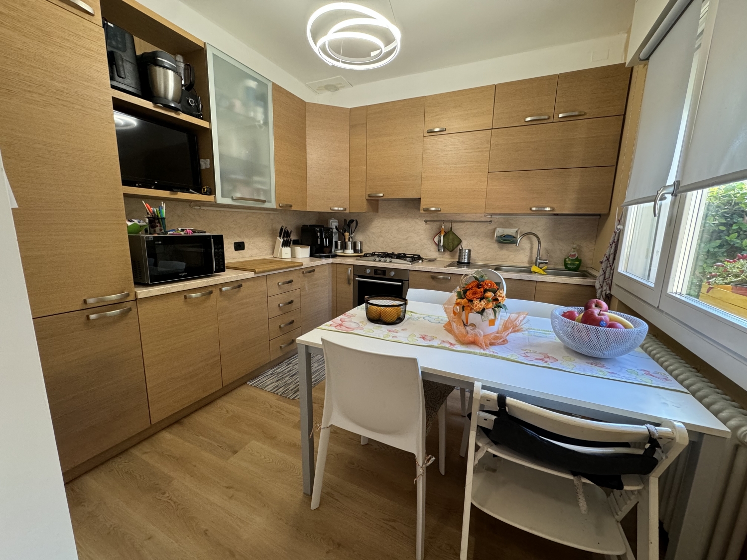 In zona residenziale e centrale al paese, bello e luminoso appartamento, recentemente rinnovato di finiture come pavimenti e infissi ma anche di impianti, disposto al piano terra con ingresso autonomo da piacevole scoperto privato con un accogliente porticato che anticipa l’ingresso, la zona giorno è composta da ampio salotto e spaziosa cucina separata, il grande disimpegno conduce alla zona notte con 2 camere grandi e bel bagno, direttamente collegato da scala interna il piano interrato composto da garage, loc. lavanderia, ripostiglio, centr. termica e cantina/taverna. Nel prezzo viene compreso l’arredo di cucina, bagno, stufa a pellets, casetta in legno, imp. d’aria condizionata e zanzariere