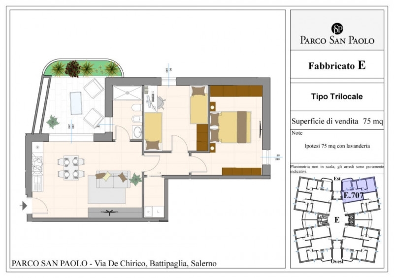Parco san paolo è il complesso residenziale di nuova costruzione che sorge nell'area dell'ex zuccherificio di battipaglia.a due passi dal centro e dalla stazione ferroviaria e in prossimità dello svincolo autostradale salerno-reggio calabriaedifici a consumo energia quasi zero.le abitazioni sono progettate in accordo alla sostenibilità energetico-ambientale degli edifici cosù come previsto dal procotollo itaca, riconosciuto da tutte le regioni italiane ed utilizzato sia nel contesto pubblico che in quello privato.i materiali utilizzati per la costruzione garantiscono il massimo comfort termico e acustico e al contempo consentono di abbattere i costi destinati ai consumi.un parco immerso nel verde con tantissime comoditàogni edificio ha un piano interrato destinato a parcheggi, composto da box auto e posti auto e direttamente raggiungibile tramite l'ascensore.nel parco sono previsti ulteriori parcheggi pubblici e zone di verde con alberature autoctone.l'annuncio si riferisce ad un trilocale di 75mq+lavanderia posto al primo piano di un edificio di 7 piani totali ed è composto:2 camera matrimoniale, 1 soggiorno con angolo living e cucina a vista, 1 bagno padronale, 1 lavanderia e ampio terrazzo.tutti gli immobili si possono personalizzare secondo le esigenze del cliente tra cui anche la scelta del capitolato.inoltre sono detraibili costi fino a un massimo di 96.000 € grazie al sisma bonus oltre che il bonus prima casa fornendo un grosso vantaggio.sono acquistabili box a partire da 1000€ al mq.