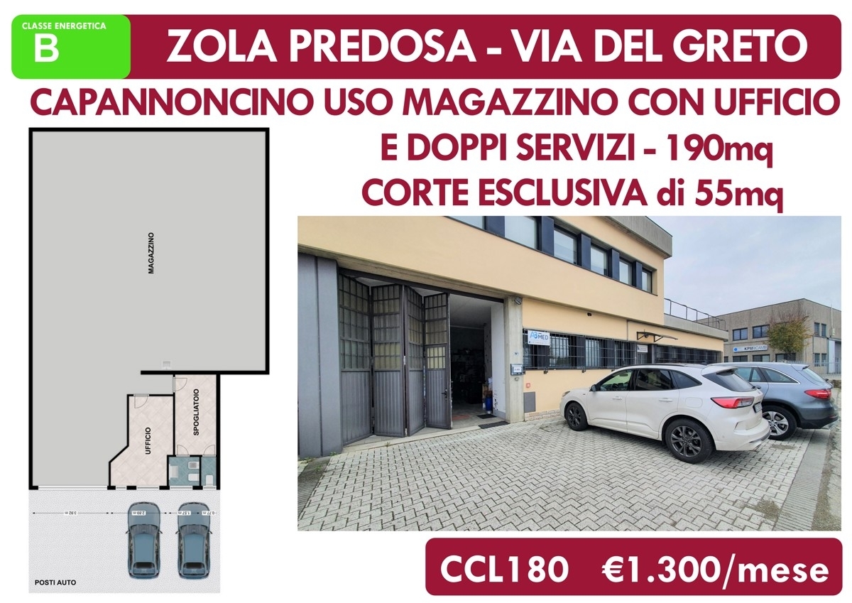 Zola predosa - via del greto: libero dal 31 maggio 2023 capannoncino ad uso magazzino, volendo in parte soppalcabile, di 165mq con annessi ufficio, spogliatoio e doppi servizi per complessivi 190mq . Corte esclusiva di circa 55mq con possibilità di parcheggio. Ape:b. Rif.ccl180 euro 1.300/mese oltre iva