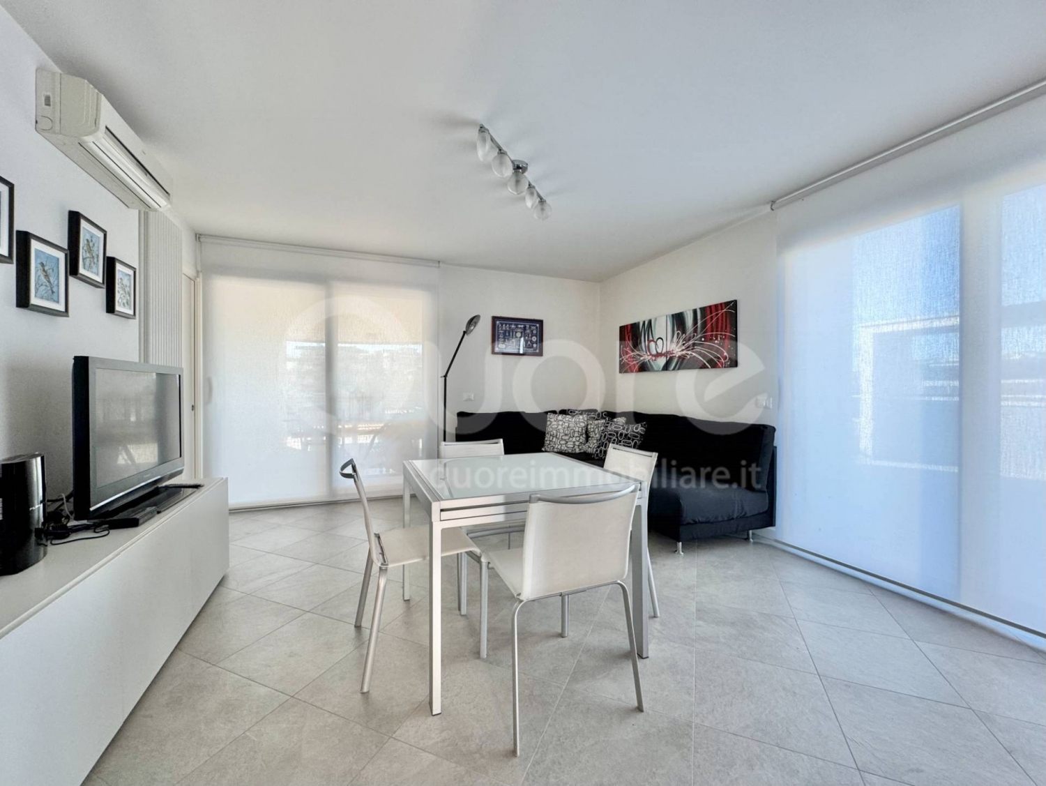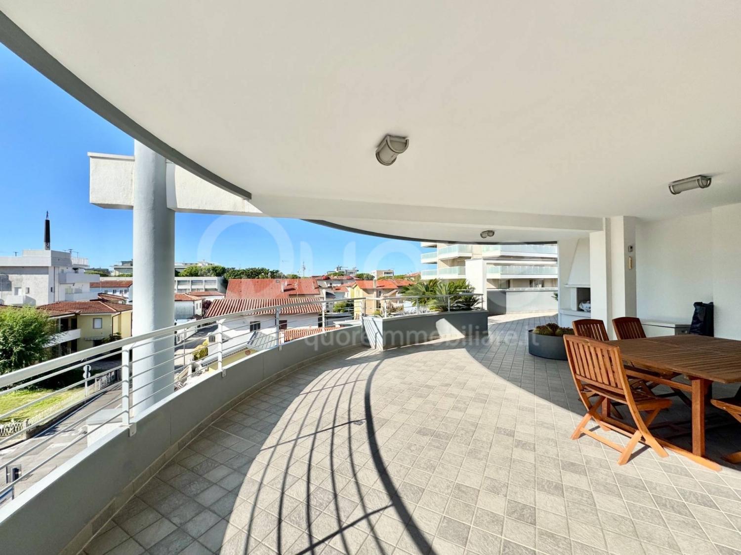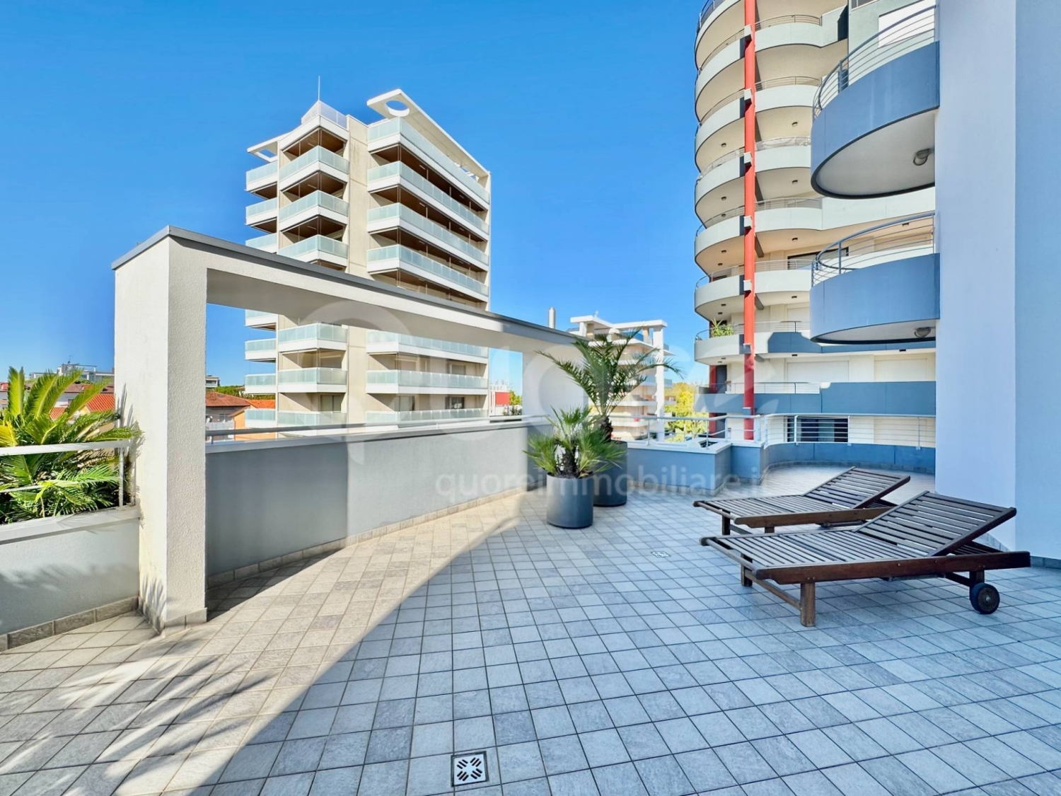 Blu mare è un esclusivo complesso residenziale di recente costruzione composto da sole 7 unità abitative, situato a pochi passi dalla centralissima piazza fontana di lignano sabbiadoro.la posizione, tranquilla e riservata, consente di raggiungere comodamente la spiaggia (a meno di 400 m), la rinomata terrazza mare e il centro pedonale.l'appartamento, posto al terzo piano, si distingue per una luminosa zona living open space con cucina a vista ed un magnifico terrazzo di 100 mq in parte coperto. La zona notte comprende un disimpegno, un'ampia camera matrimoniale con bagno privato e accesso al terrazzo, una seconda camera matrimoniale con terrazzo privato e un secondo bagno finestrato.l'immobile è dotato di ogni confort: serramenti scorrevoli in alluminio con vetrocamera, portoncino blindato, tapparelle elettriche in alluminio, impianto di climatizzazione in tutti gli ambienti, impianto di riscaldamento autonomo, cappotto esterno e sistema di allarme. perfetto anche per un utilizzo residenziale continuativo. Viene venduto completo di arredo.completano la proprietà un posto auto esterno, un box auto doppio ed una cantina.superfici commerciali:appartamento 76 mqterrazze 100 mqcantina 5 mqposto auto 15 mqbox auto 26 mq