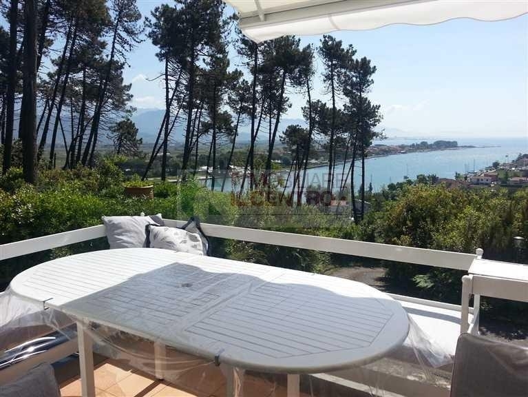In complesso residenziale completamente recintato, porzione di bifamiliare con splendida vista sul fiume e mare disposta su due livelli composta da pt taverna con cucina abitabile, tinello, soggiorno, camera e bagno. P1 ingresso da terrazza abitabile, cucina abitabile, soggiorno, disimpegno, tre camere matrimoniali e doppi servizi. Terreno di proprietà di 1500 mq con entrostante piscina. Completa di arredi. Ottime rifiniture. Cl en. B ipe 49,88 kwh/mq anno