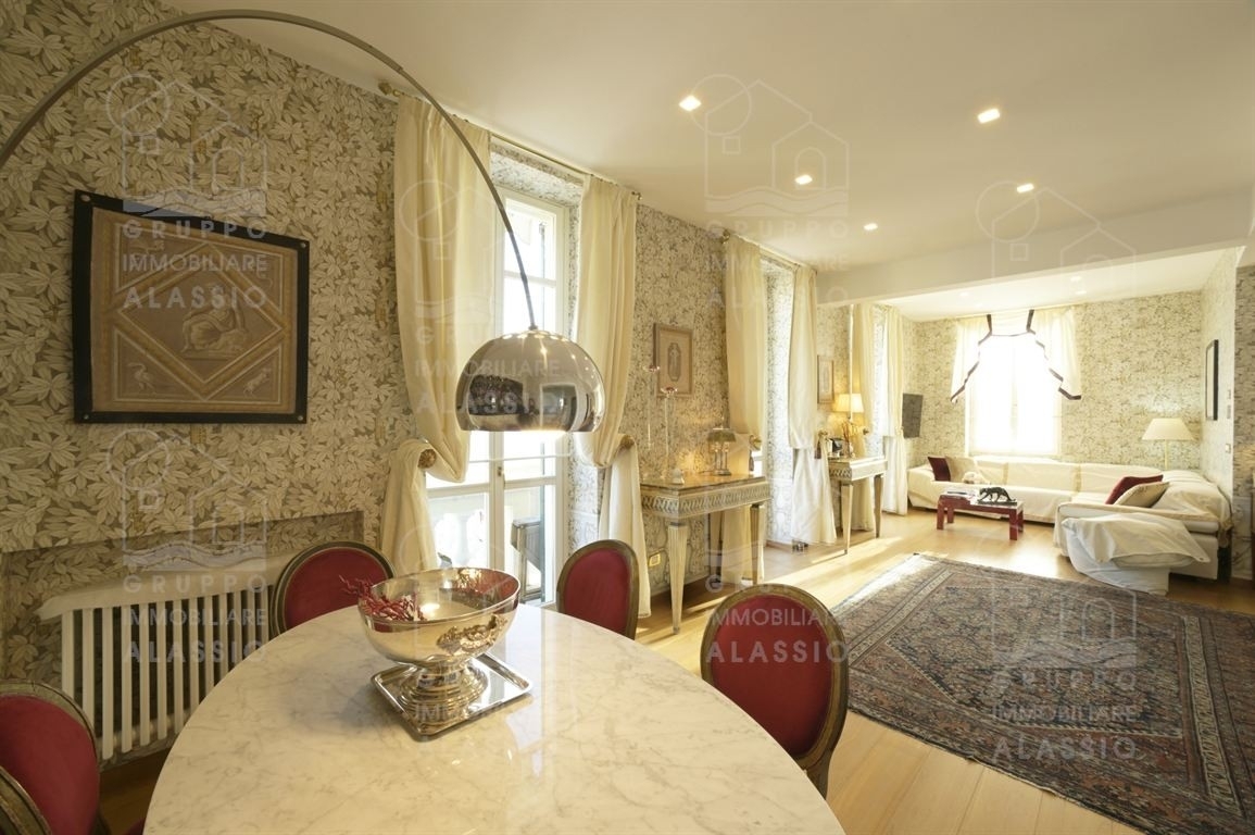 E' difficile trovare ad alassio un appartamento che abbia tutte le caratteristiche di cui gode questo esclusivo e prestigioso attico vista golfo.a partire dalla sua posizione incastonata come una gemma preziosa nell'esclusiva cornice di borgo coscia, soleggiata sino al tramonto.l'edificio è una pregevole villa d'epoca, in ottime condizioni, affacciata sul mare.entrando nell'appartamento, si è accolti da un ingresso di rappresentanza che prelude al luminoso salone caratterizzato da ben tre portefinestre vista mare e dall'elegante terrazzo sul golfo.al medesimo livello troviamo la cucina con doppia porta scorrevole verso la zona pranzo del salone, un bagno finestrato, una stanza dedicata alla cabina armadi con zona lavanderia, uno studiolo aperto sulla teatrale scala in cristallo che porta al piano superiore.qui troviamo l'immancabile suite con terrazzo vista mare, attrezzata con armadi a scomparsa, ed una stanza da bagno finestrata. in questa pregevole dimora tutto parla della sua esclusività; dalle tappezzerie di un noto artista e designer ai ricchi arredi, dalle prestigiose finiture all'eccellente domotica.completano il piacere di abitare in questo desiderabile attico i due posti auto coperti, facilmente accessibili, e la grande cantina dove poter ricoverare moto, scooter e biciclette.tutte queste caratteristiche unitamente all'acceso indipendente, al termo autonomo, all'aria condizionata, agli infissi, all'impianto antifurto e tanto altro ancora, rendono questo immobile un riferimento assoluto nel panorama immobiliare di alassio.