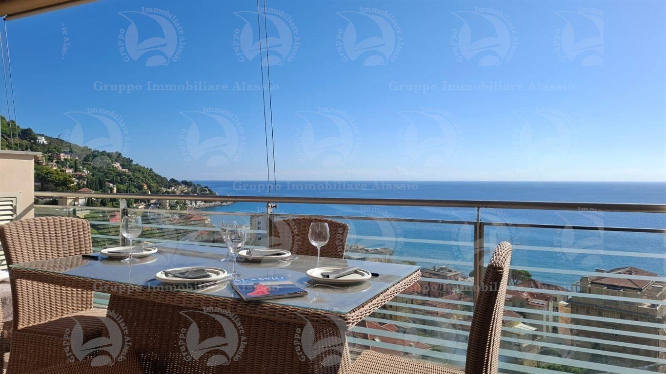 Alassio, primissima collina di levante, proponiamo questo esclusivo bilocale con vetrate vista mare ed un grande terrazzo.l'appartamento è all'interno di un contesto esclusivo, di recente realizzazione dotato di piscina vista mare.situato al terzo piano fuori terra, l'appartamento è composto da soggiorno con cucina a vista e vetrata vista mare, camera da letto matrimoniale con vetrata vista mare, bagno, terrazzo.entrambe le stanze accedono direttamente al grande terrazzo da cui si gode la vista totale della baia del sole. l'arredamento, curato da architetti e realizzato su misura con gusto e qualità, è incluso nel prezzo di vendita.l'appartamento è corredato di un grande e comodo posto auto di proprietà, facilmente accessibile con qualunque auto, dalla supersportiva al grande suv.e per ricoverare le biciclette, una comoda cantina, raggiungibile senza alcun gradino.