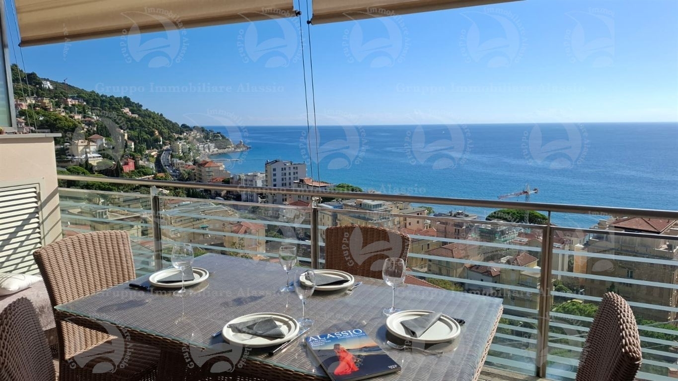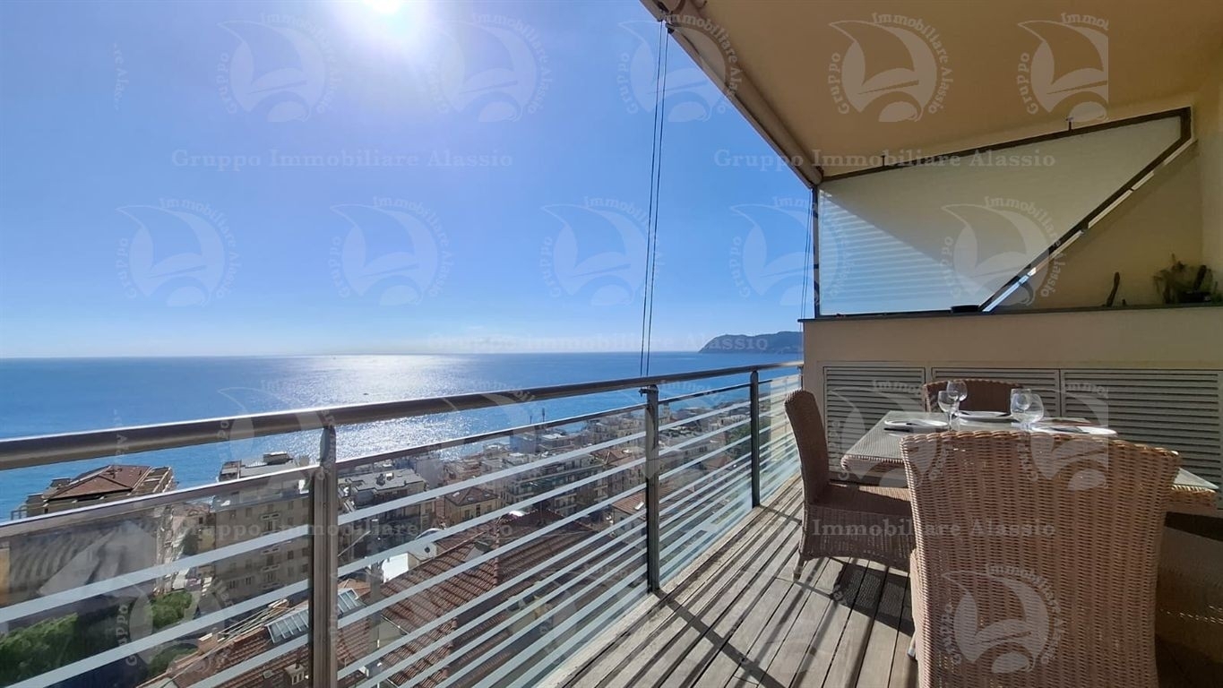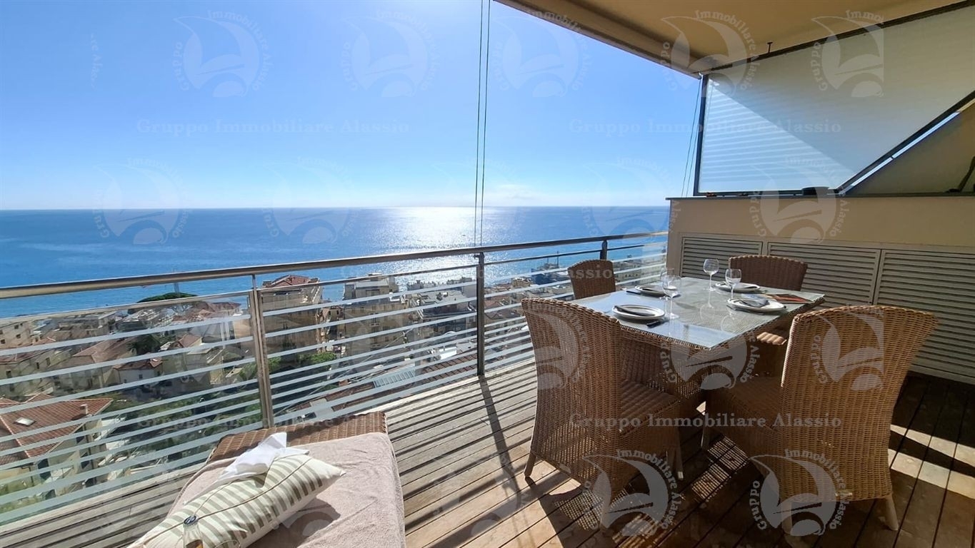 Alassio, primissima collina di levante, proponiamo questo esclusivo bilocale con vetrate vista mare ed un grande terrazzo.l'appartamento è all'interno di un contesto esclusivo, di recente realizzazione dotato di piscina vista mare.situato al terzo piano fuori terra, l'appartamento è composto da soggiorno con cucina a vista e vetrata vista mare, camera da letto matrimoniale con vetrata vista mare, bagno, terrazzo.entrambe le stanze accedono direttamente al grande terrazzo da cui si gode la vista totale della baia del sole. l'arredamento, curato da architetti e realizzato su misura con gusto e qualità, è incluso nel prezzo di vendita.l'appartamento è corredato di un grande e comodo posto auto di proprietà, facilmente accessibile con qualunque auto, dalla supersportiva al grande suv.e per ricoverare le biciclette, una comoda cantina, raggiungibile senza alcun gradino.
