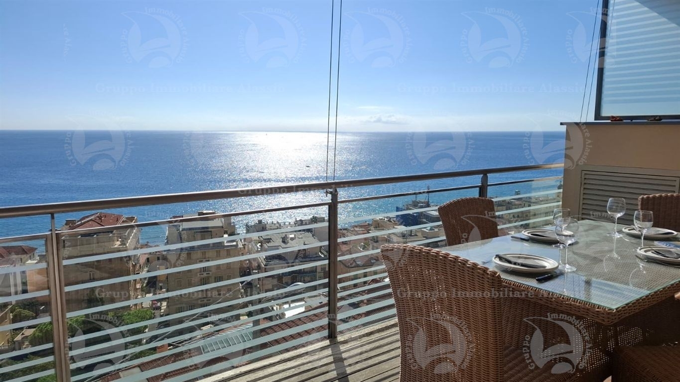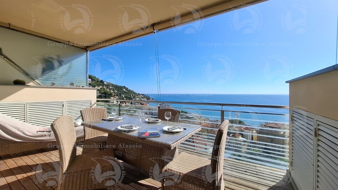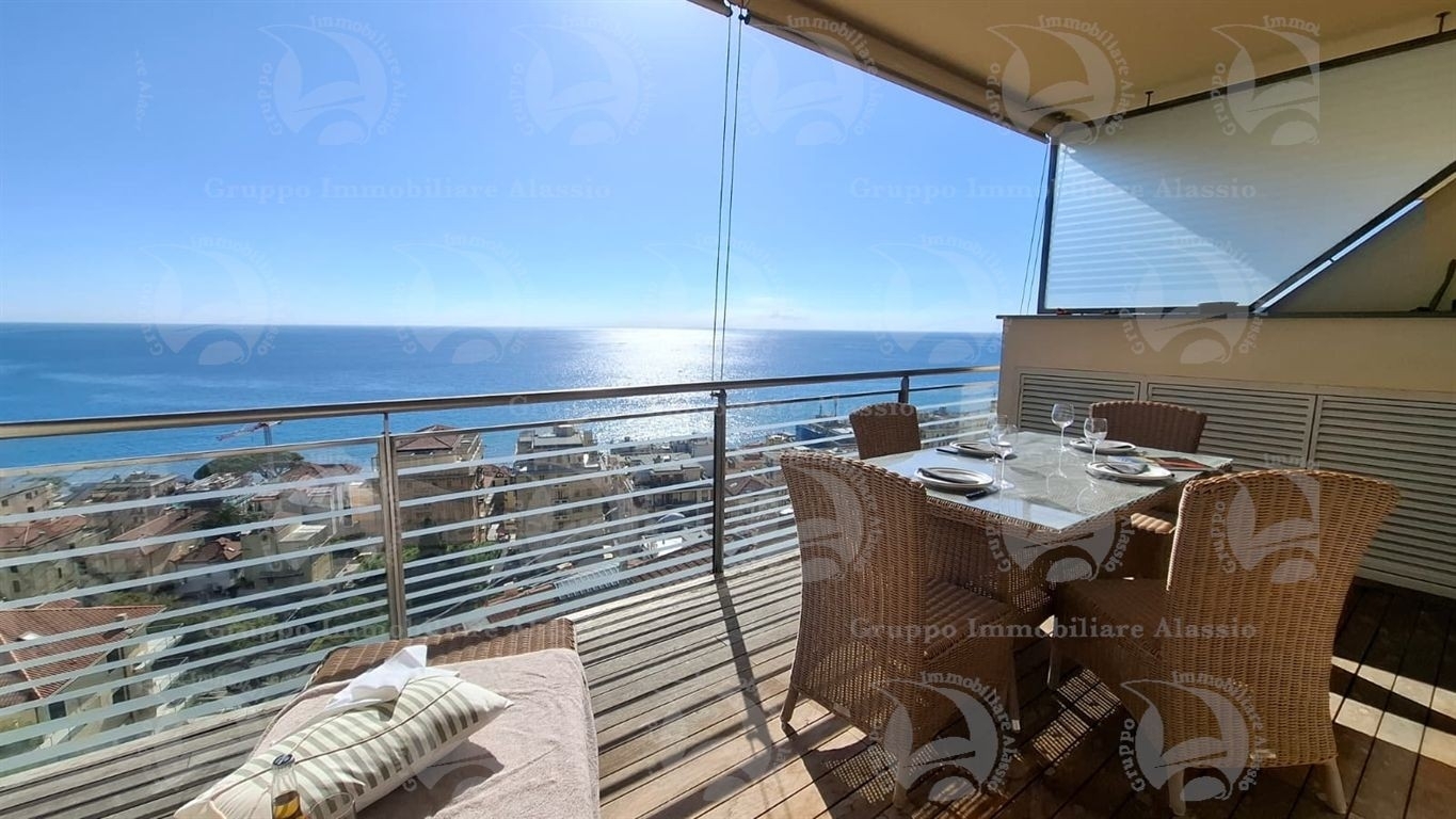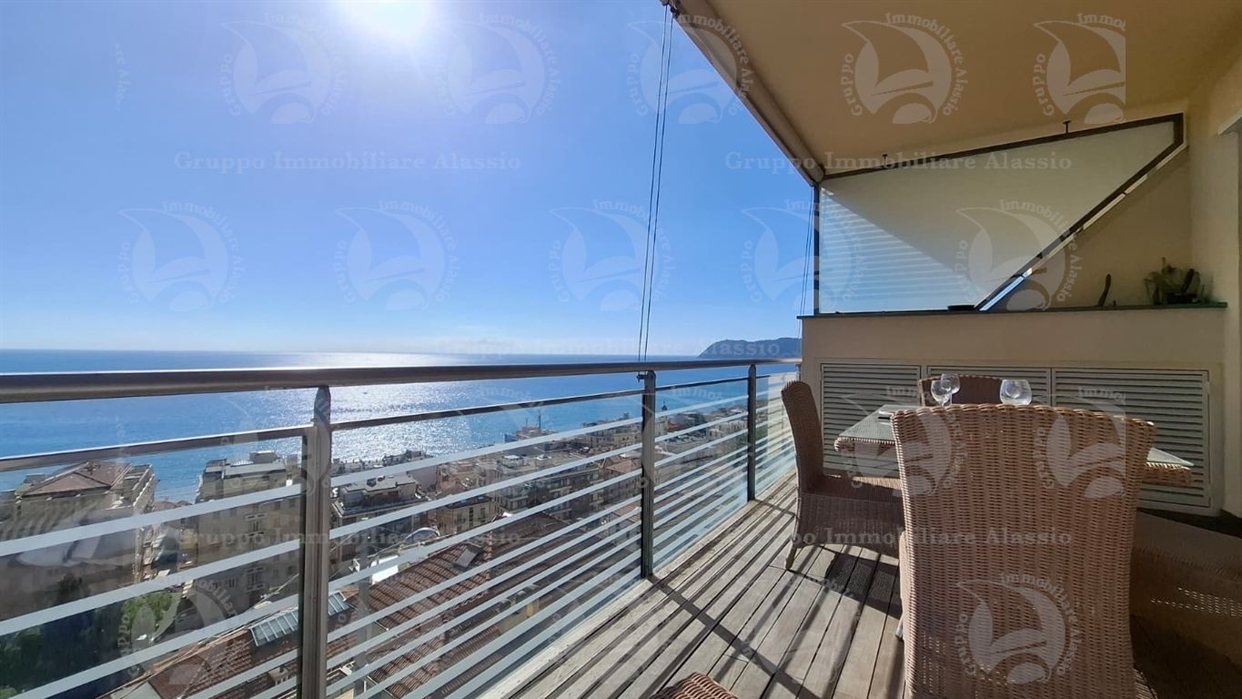 Alassio, primissima collina di levante, proponiamo questo esclusivo bilocale con vetrate vista mare ed un grande terrazzo.l'appartamento è all'interno di un contesto esclusivo, di recente realizzazione dotato di piscina vista mare.situato al terzo piano fuori terra, l'appartamento è composto da soggiorno con cucina a vista e vetrata vista mare, camera da letto matrimoniale con vetrata vista mare, bagno, terrazzo.entrambe le stanze accedono direttamente al grande terrazzo da cui si gode la vista totale della baia del sole. l'arredamento, curato da architetti e realizzato su misura con gusto e qualità, è incluso nel prezzo di vendita.l'appartamento è corredato di un grande e comodo posto auto di proprietà, facilmente accessibile con qualunque auto, dalla supersportiva al grande suv.e per ricoverare le biciclette, una comoda cantina, raggiungibile senza alcun gradino.