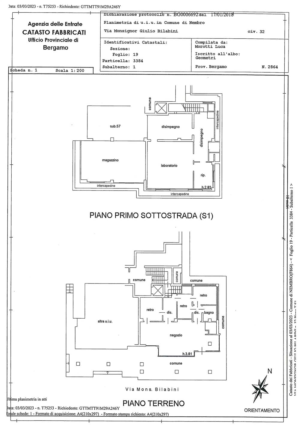Centralissimo negozio h 3,81 metri posto al piano terra con scala interna e montacarichi che porta al piano semiinterrato, magazzino attrezzato con impiantistica adeguata per legge. 4 vetrine al piano terra , composto da un vano negozio,bagno,disimpegno,retro, retro, disimpegno, retro, montacarichi. Porticato coperto fronte strada visibile con parcheggi. Piano primo sottostrada, intercapedine, scala che scende dal negozio al magazzino internamente, magazzino, laboratorio,disimpegno,disimpegno,ripostiglio. H 2,83 metri. Prende luce dai lucernari finestrati nell'intercapedine. Questo negozio si presta per diverse attività commerciali chiedendo al comune di nembro ufficio tecnico e all'amministratore condominiale del palazzo dove ubicato il negozio. Precedentemente vi era un ortopedico. La zona è di forte passaggio nel centro storico di nembro. classe energetica: e epi: 691,49 kwh/m3 anno