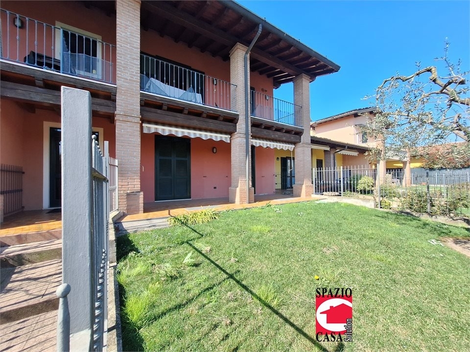In grazioso e bentenuto contesto residenziale di complessive 10 unita' circa, posizionato a pochi passi dal centro paese, ma in una zona tranquilla e senza disturbi esterni, proponiamo un trilocale veramente in ordine al piano terra. Internamente e' composto da soggiorno e cucina separate, i locali si affacciano su un portico di circa 20 mq, a sua volta prospiciente al giardino privato di 70 mq. L'abitazione e' poi composta da due camere da letto (una matrimonisle), bagno con finestra , ripostiglio, balcone in zona notte. Al piano interrato ampia cantina di circa 10 mq, oltre ad autorimessa doppia/tripla di circa 35/40 mq. L'appartamento e' autonomo, servito da antifurto, canne fumarie, climatizzatore, nuova caldaia, luci di emergenza, impianto di irrigazione. - maggiori dettagli: porta blindata, cucina abitabile, cassaforte, sistema di allarme, portico, climatizzato