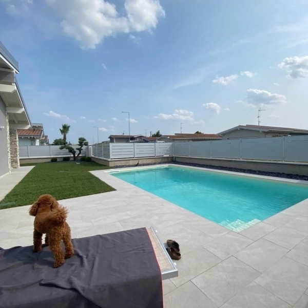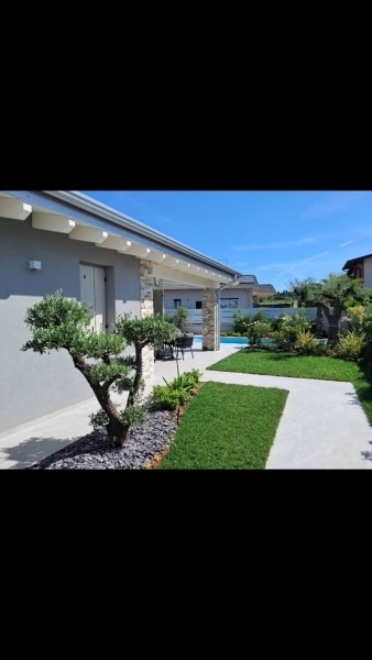 In nuovo complesso residenziale di sole ville in zona tranquilla di lonato del garda ma vicina ai servizi e a poca distanza dal paese villa singola con piscina su lotto di 600 mq con sviluppo su unico piano e box doppio con lavanderia affiancato. Consegnata con finiture di qualità e impiantistica tecnologicamente avanzata tra cui impianto fotovoltaico da 3 kw incluso, raffrescamento e riscaldamento a pavimento con split per la deumidificazione da capitolato. costruzione tradizionale antisismica in classe a4. L'abitazione è composta da soggiorno con cucina di 41 mq, 3 o 4 camere di 20, 12 e 9 mq e 1/2 bagni come da planimetria allegata. Box doppio di 34 mq con lavanderia. Porticato esterno di 15 mq. ampio giardino. Il prezzo comprende la piscina installata e funzionante. Possibilità di varianti sulla diposizione dei locali e anche di misure maggiori o minori. classe energetica = a4 ipe = 3.51 kwh/mq