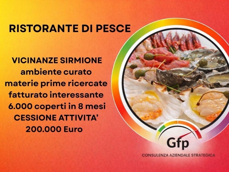 Nelle vicinanze di sirmione si propone cessione di ristorante di pesce a gestione familiare, attività conosciuta e apprezzata con clientela fidelizzata del territorio e delle province limitrofe. Locale curato e operativo, superficie 75 mq oltre interrato e garage, circa 70 coperti totali (32 interni + 38 in veranda privata riscaldata e climatizzata, compresa nella locazione). Attività aperta 8 mesi con circa 6.000 coperti sviluppati nel periodo. canone locazione muri ? 2.000 + iva mensili. ottime recensioni, cucina di qualità, gestione snella con possibilità di affiancamento iniziale. prezzo richiesto ? 200.000. Trattativa riservata.rif ? gfp ? consulenza aziendale strategica | ? gianfranco passaia classe energetica = a4
