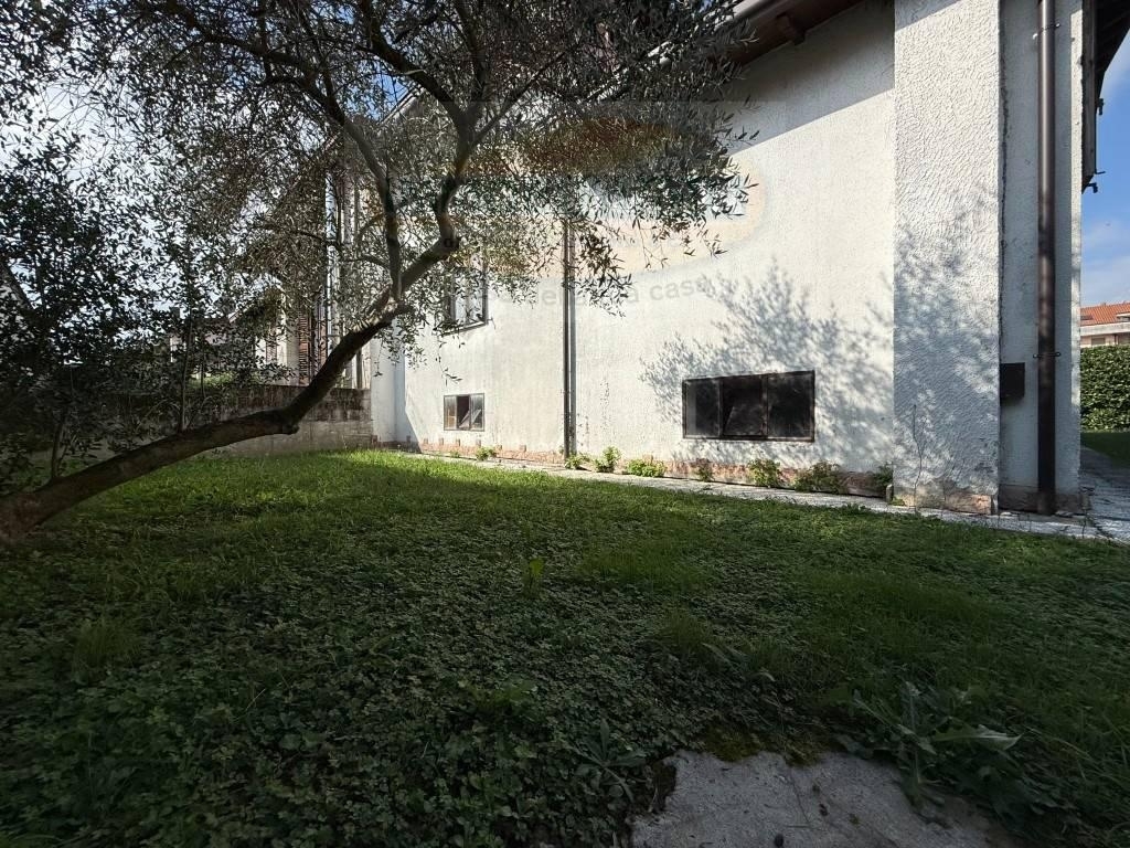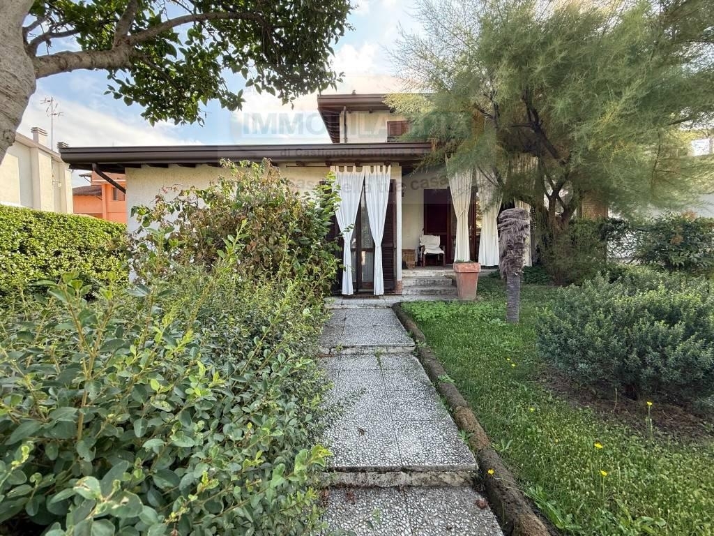 Esclusiva! in zona tranquilla di sole ville, vicina al centro, disponiamo di una bella bifamiliare di 183 mq disposta su un unico livello abitativo e circondata dal suo giardino privato. La casa è cosù composta: ingresso nella cucina abitabile, salone doppio con portafinestra dalla quale si può accedere al porticato coperto ed al giardino anteriore, abbiamo poi il disimpegno che accompagna nella zona notte dove sono presenti tre camere da letto di cui una matrimoniale e due camerette singole, è presente poi il bagno con vasca. Tutte le stanze hanno finestre che affacciano sul giardino! abbiamo poi la scala a chiocciola dalla quale si accede sia al sottotetto che al piano seminterrato dove troviamo il box auto ed un locale multiuso. l'immobile dispone di riscaldamento autonomo, serramenti interni doppio vetro/legno , persiane legno e zanzariere, il tetto è stato rifatto nel 2018.